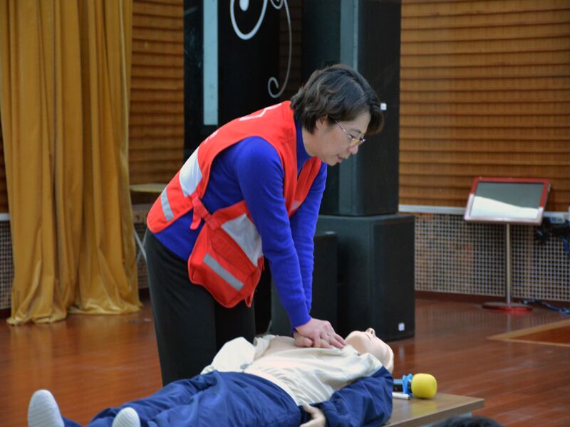 此次培训包括急救的重要性、心肺复苏、创伤救护三个主要内容。杨老师还特意带来了急救知识书籍及假体教学道具,方便为同学们讲解急救知识,示范急救方法。实践操作环节,杨老师和7位急救教员手把手地指导同学们对人体模型进行心肺复苏和人工呼吸。同学们也兴致勃勃,积极认真地跟着老师一次次模拟练习。本次急救培训共有99名同学参加,并且全部通过测试成为初级急救员。