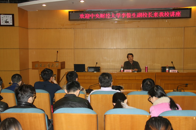 11月18日,中央财经大学副校长李俊生教授应邀来到我校,在阜成路校区为经济学院师生作了题为 “市场失灵理论的失灵与财政学理论基础的重构”的学术讲座。讲座由李朝鲜副校长主持。经济学院教师及研究生100余人参加了讲座。