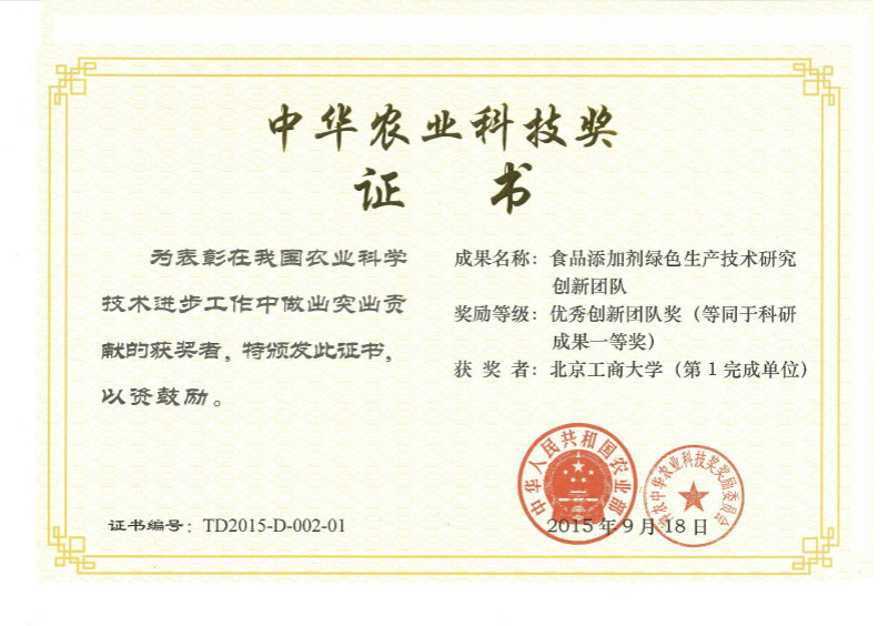 近日,由我校校长孙宝国带领的“食品添加剂绿色生产技术研究创新团队”荣获农业部中华农业科技奖一等奖(等同于科研成果一等奖)。该奖项设立于2006年,经农业部同意、科技部批准,中国农学会设立,在促进农业科技发展、推动行业科技进步中起到激励和导向作用,重点奖励为我国农业科学技术进步和创新做出突出贡献的集体和个人。我校获奖的团队成员有孙宝国、李秀婷、曹雁平、宋焕禄、徐宝财、王成涛、郑福平、王静、杨贞耐、张敏、田红玉、谢建春、陈存社、刘玉平、陈海涛、韩富、辛秀兰、廖永红、黄明泉、王凤寰等。