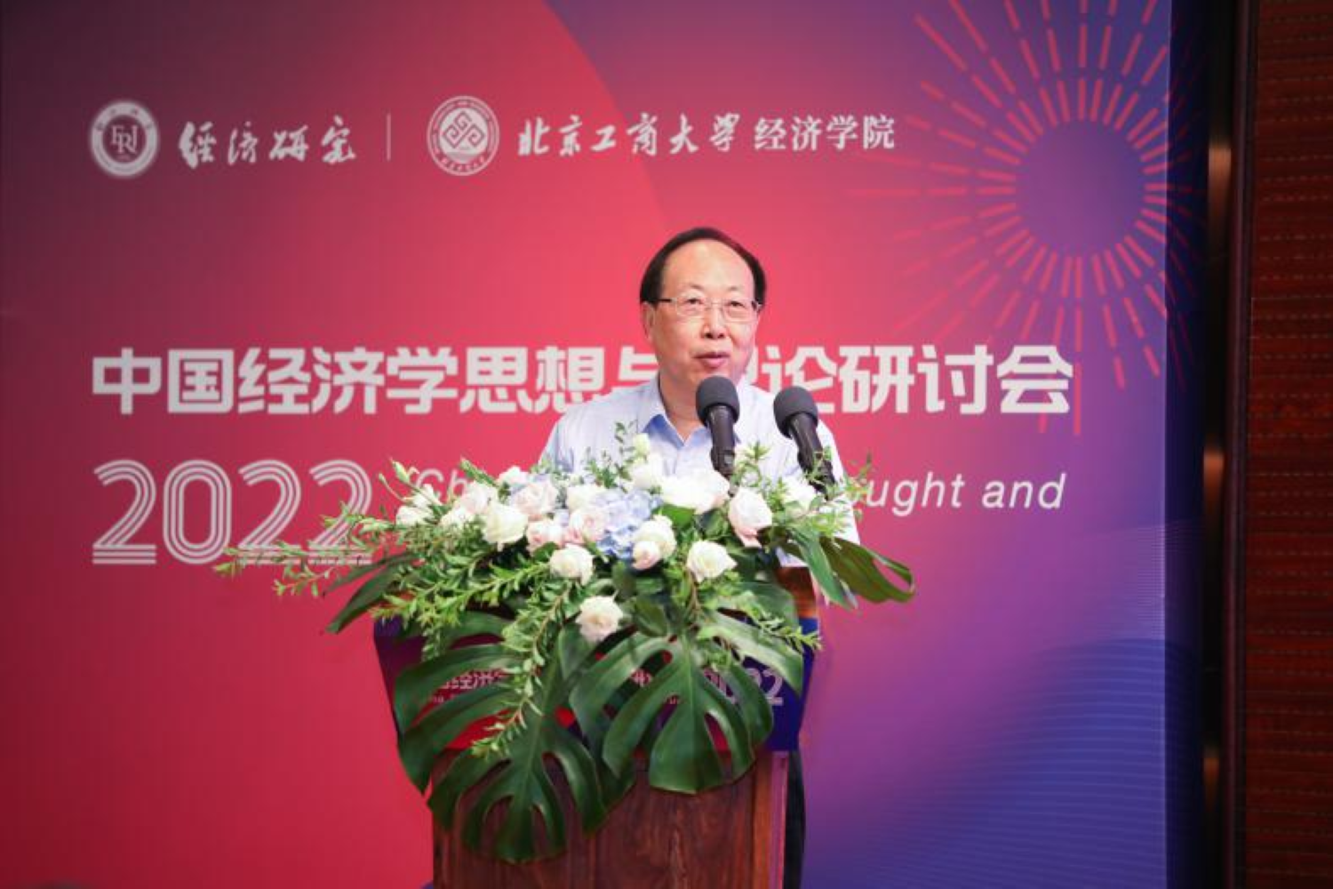 开幕式上,校党委书记黄先开致辞。他在致辞中对各位参会的专家和代表表示热烈欢迎和感谢。他指出,2022年是我国进入全面建设社会主义现代化国家、向第二个百年奋斗目标进军新征程的重要一年,党的二十大也即将召开。当下研讨引领时代发展的经济学理论,具有特殊重要的意义。恰逢《习近平经济思想学习纲要》发行,习近平经济思想深刻回答了新时代经济发展怎么看、怎么干等一系列重大理论和实践问题,是我国经济高质量发展、全面建设社会主义现代化国家的科学指南,也是现代经济学思想与理论研究的根本遵循。黄先开呼吁经济学者坚持不懈用习近平新时代中国特色社会主义思想武装头脑、指导实践、推动工作,立足于中国经济发展的实践历程,在思想和理论上不断创新,为新时代中国经济发展建言献策。黄先开表示,北京工商大学是新中国成立后中央批准创办的第一所商科学校,传承与生俱来的红色基因与商科血脉,始终坚持党的领导,深耕家国情怀,开拓创新,走在前列,是北京市重点建设的高水平研究型大学。应用经济学科是学校的优势学科,多年来聚焦数字经济、新发展格局、财税体制改革、普惠金融、数字金融、“一带一路”等重大问题,主动服务国家、区域和行业发展,为国家相关规划政策制定及首都经济社会发展贡献智慧。黄先开书记预祝本届研讨会取得丰硕成果,成为引领中国经济学思想与理论前行方向的盛会。