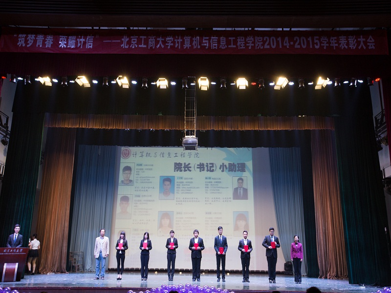 12月27日,计信学院在良乡校区举办以“筑梦青春,荣耀计信”为主题的2014-2015学年表彰大会。学校方德英副校长出席大会。中国人民解放军61623部队32分队、北京凯捷风公交客运公司、房山区伟业嘉园社区、房山区佛子庄中心小学、北京秋水长天科贸有限责任公司、北京青年报、北青社区传媒等共建单位代表,学院领导班子成员、系主任、班主任及学生参加大会。