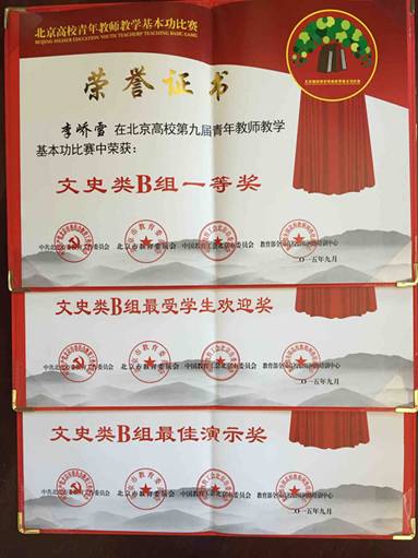 在个人奖项中,理学院曹显兵老师荣获2015年北京市先进工作者,艺传学院李峤雪老师荣获北京高校第九届青年教师教学基本功比赛文史类B组一等奖、最佳演示奖、最受学生欢迎奖,艺传学院高丽华老师荣获北京高校第九届青年教师教学基本功比赛优秀指导教师奖,艺传学院何艳老师荣获北京高校第九届青年教师教学基本功论文比赛获优秀奖,学校工会李艳萍老师荣获2015年北京市优秀工会工作者。
