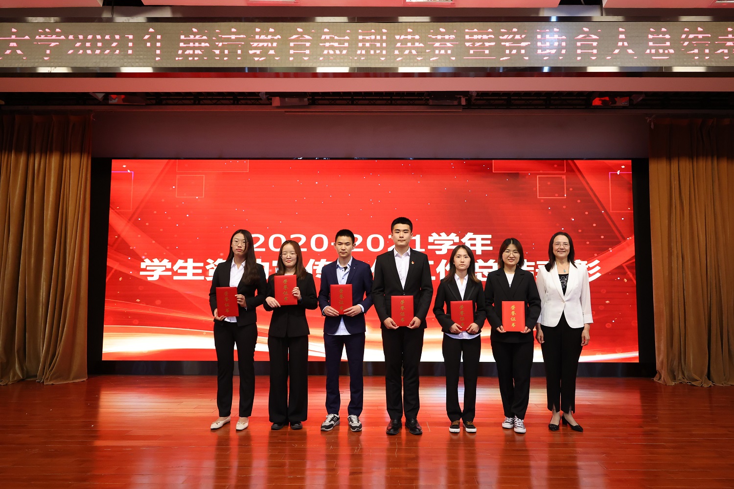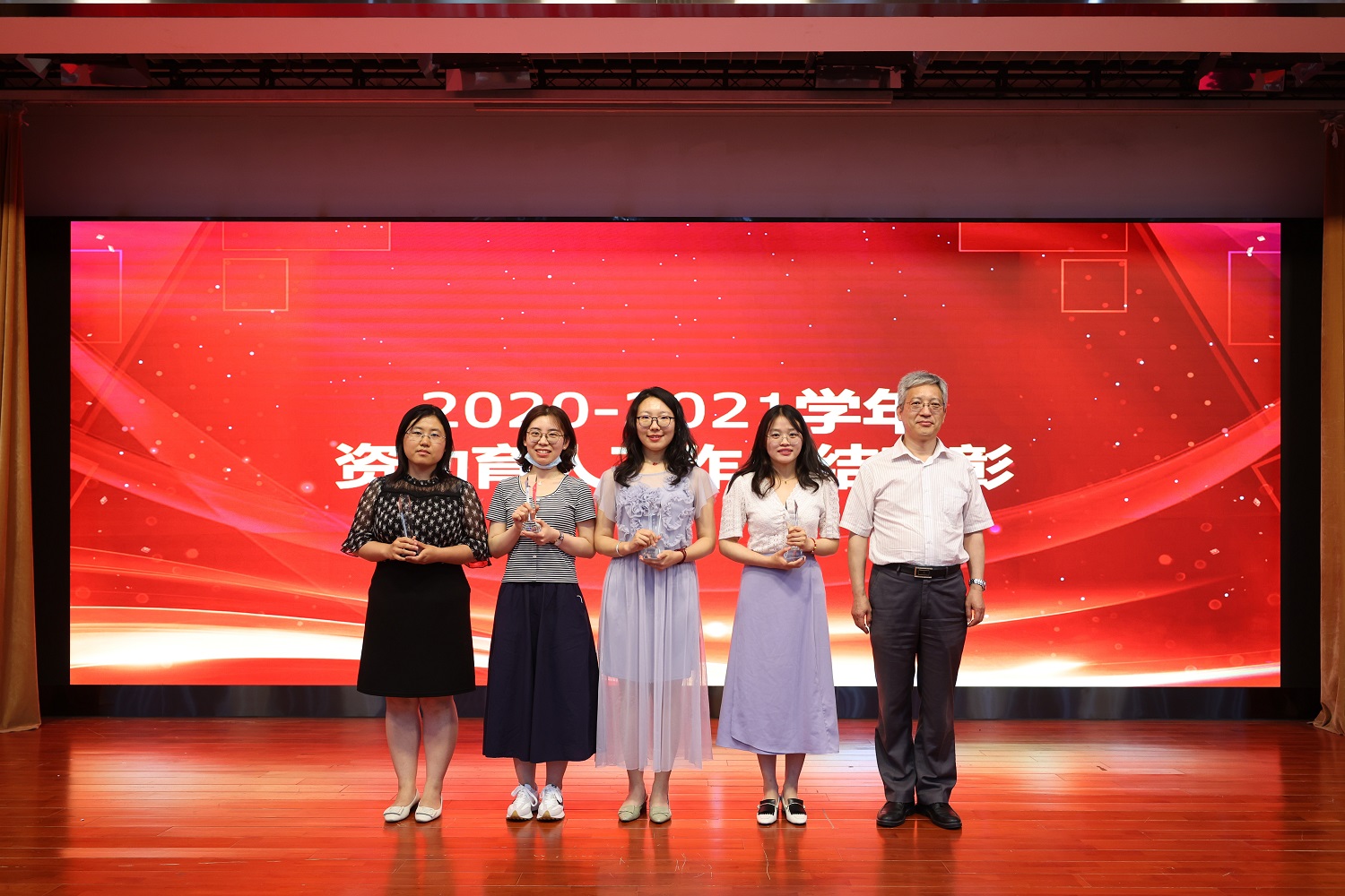 在总结表彰环节,先后播放《“学生资助宣传大使”工作纪实》和《资助育人 筑梦青春》视频分别回顾了我校学生资助宣传大使团队在开展政策宣传、事迹宣讲、社会实践、防疫抗疫等方面开展的主要工作以及学校在构建资助育人体系、着力“两个精准”、搭建育人载体、培树励志典型所组织的一系列资助育人活动,充分展现了学校近年来在深化资助育人理念、拓展特色品牌活动,为家庭经济困难学生成长成才保驾护航方面取得的突出成绩。张梅为我校2020-2021年度“优秀学生资助宣传大使”轻工科学技术学院应化192班赵雪莹,化学与材料工程学院材料182班张周雅,人工智能学院信息182班邓志常,商学院注会184班林一凡、工商19班苏亚媛,计算机学院软件181班李萌战颁发了荣誉证书。李中奇副书记为学院资助育人工作优秀组织奖传媒与设计学院、数学与统计学院、化学与材料工程学院、外国语学院颁发了荣誉奖杯。