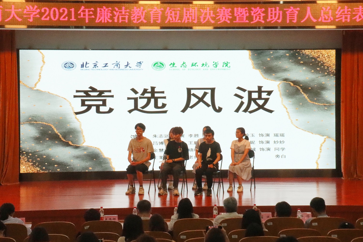 活动在精彩的廉洁教育短剧决赛中拉开帷幕。在今年的廉洁教育活动中,学生处首次将大学生廉洁教育与每年5月开展的诚信教育月系列活动相结合,组织开展以“品·廉述工商——我身边的廉洁故事”为主题的廉洁教育短剧大赛。各学院积极参与、精心准备,从脚本撰写到演出编排全部由学生独立完成。经过初赛选拔,最终6个作品进入决赛。参演作品紧紧围绕发生在大学生身边的诚信考试、班级竞选、反诈防骗、过度消费、求职简历、清廉家风等故事题材进行生动演绎,充分体现了廉洁和诚信教育不仅是大学生的必修课,更是每名同学人生道路上的通行证。经现场教师和学生评委综合评分,数学与统计学院《作茧自缚》荣获一等奖,化学与材料工程学院《遗憾》、传媒与设计学院《草莓蓝莓蔓越莓,小心诈骗听到没》获二等奖,轻工科学技术学院《一份简历》、生态环境学院《竞选风波》、外国语学院《你好,赵超!》获三等奖。传媒与设计学院新闻192班王亮、数学与统计学院中外20班张文欣分获最佳男、女演员奖。