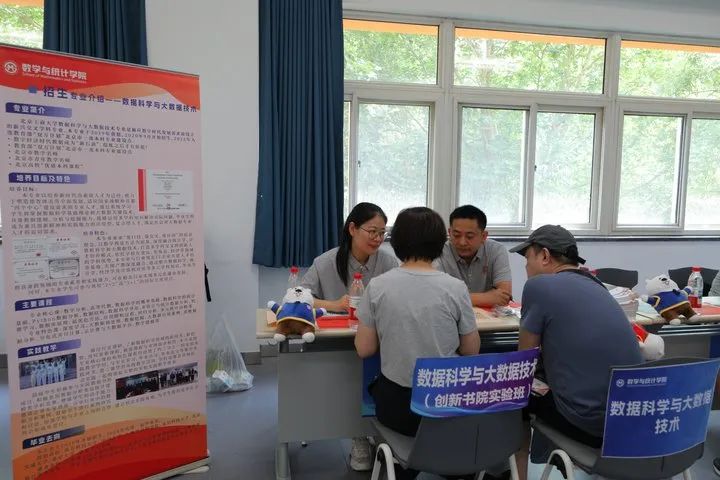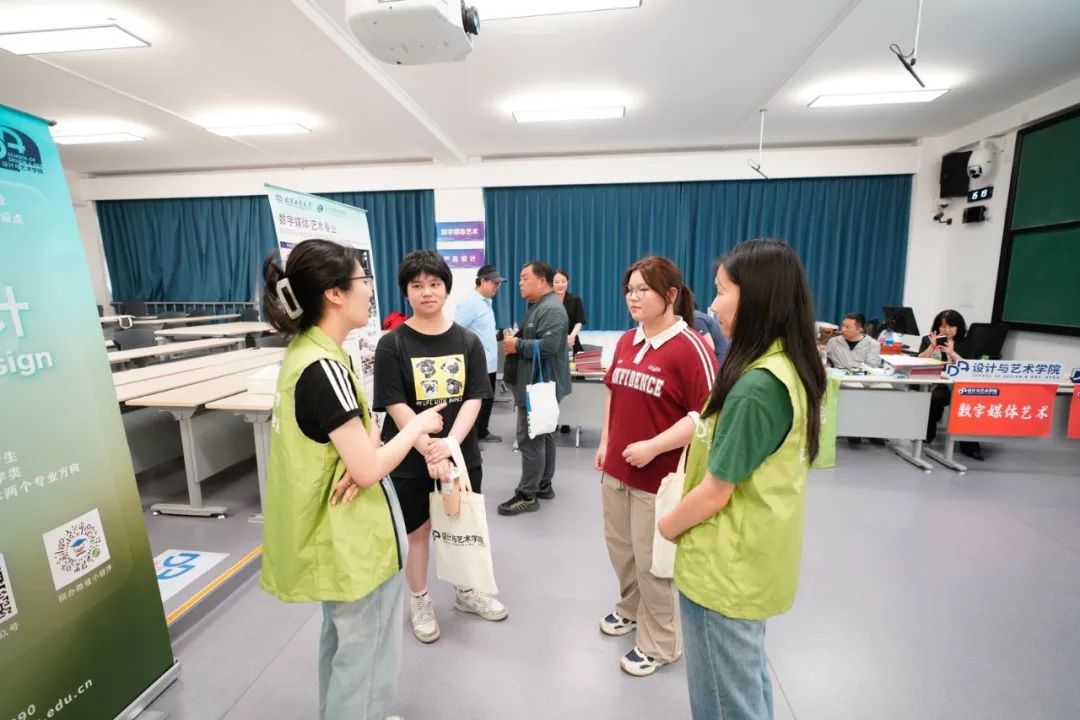 下午2点,教三楼内各学院咨询展台亮点满满。学院负责人、教授身着院服,热情洋溢地为考生和家长介绍专业特色和高招政策。科创产品和宣传材料摆满了活动现场。现场人头攒动,考生和家长积极提问,与学院老师亲切交流。
