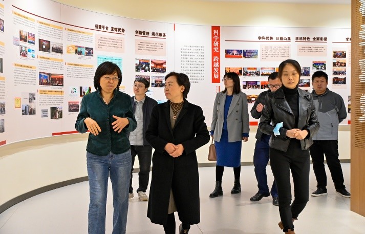 王菁华一行在文二楼、文三楼智慧教室以及数字未来中心现场了解教育教学一体化平台、知识图谱子系统、“直录直播、互联互通、资源共享”智慧教学环境等数字赋能教育教学建设情况,在中国轻工业酿酒分子工程重点实验室了解政产学研融合应用情况。在良乡图书馆和校史馆了解馆藏资源数字化建设情况,走访参观视听空间、光影空间等个性化服务育人场所。