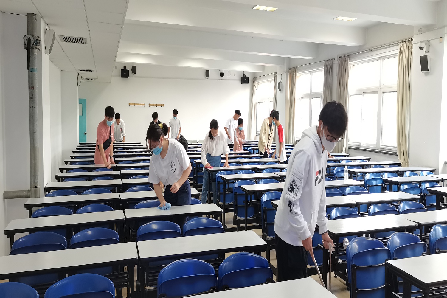 教室是同学们四载求学问道的场所。来自国际经管学院的志愿者们以小组为单位走进教室,认真擦拭桌椅、清洁地面,井然有序清洁每一个角落。一道道忙碌却可爱的身影穿梭于教室间,成长也伴随着辛勤的劳动中悄然而至。