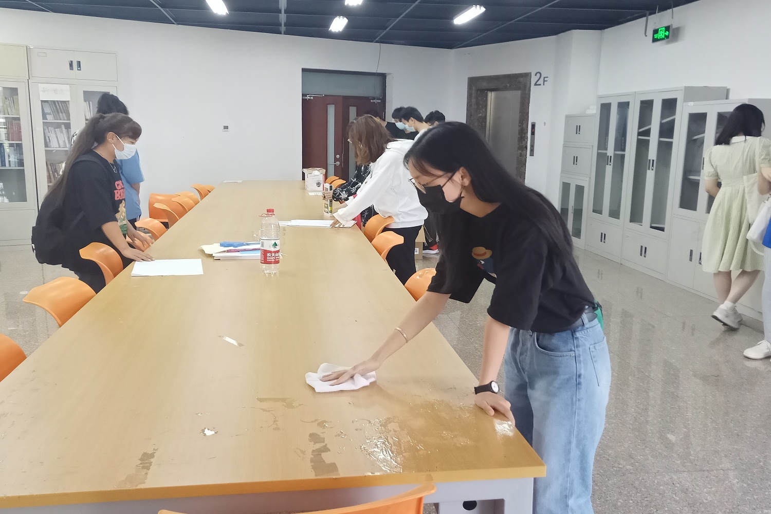 电商与物流学院、食品与健康学院、计算机学院、外国语学院、传媒与设计学院、商学院、经济学院将清洁重点放在了学院办公室、心理咨询室、会议室、教师办公室等场所。志愿者利用统一配发的劳动用具,清扫地面、擦拭玻璃、规置物品,奏响一曲由扫把、簸箕、拖布和抹布组成的清洁交响曲。在志愿者们的辛勤劳动下,一间间教学办公场所变得几净明亮,焕然一新。