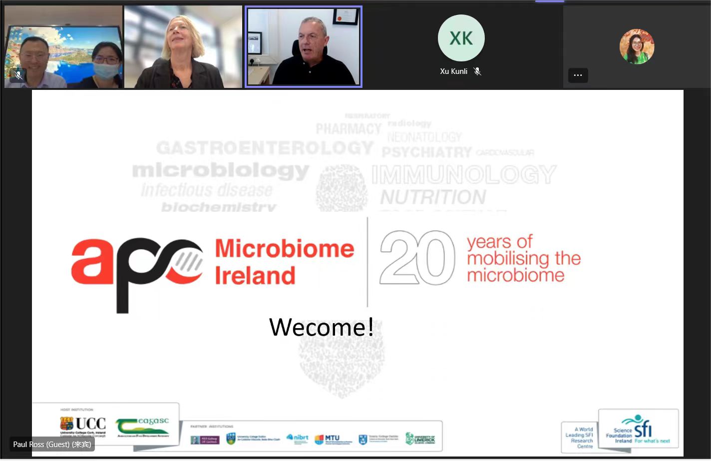 近日,爱尔兰国家APC微生物组研究所(APC Microbiome Ireland, 简称APC)、爱尔兰农业部农业与食品发展局(Teagasc)与北京工商大学食品与健康学院进行了线上合作交流。此次会议APC负责人、爱尔兰皇家科学院院士、爱尔兰科克大学保罗·罗斯(Paul Ross)教授及Teagasc负责人、爱尔兰皇家科学院院士、爱尔兰科克大学凯瑟琳·斯坦顿(Catherine Stanton)教授参会,学院院长王彦波教授、副院长王蓓教授以及孟繁宇博士参加了本次合作交流会。