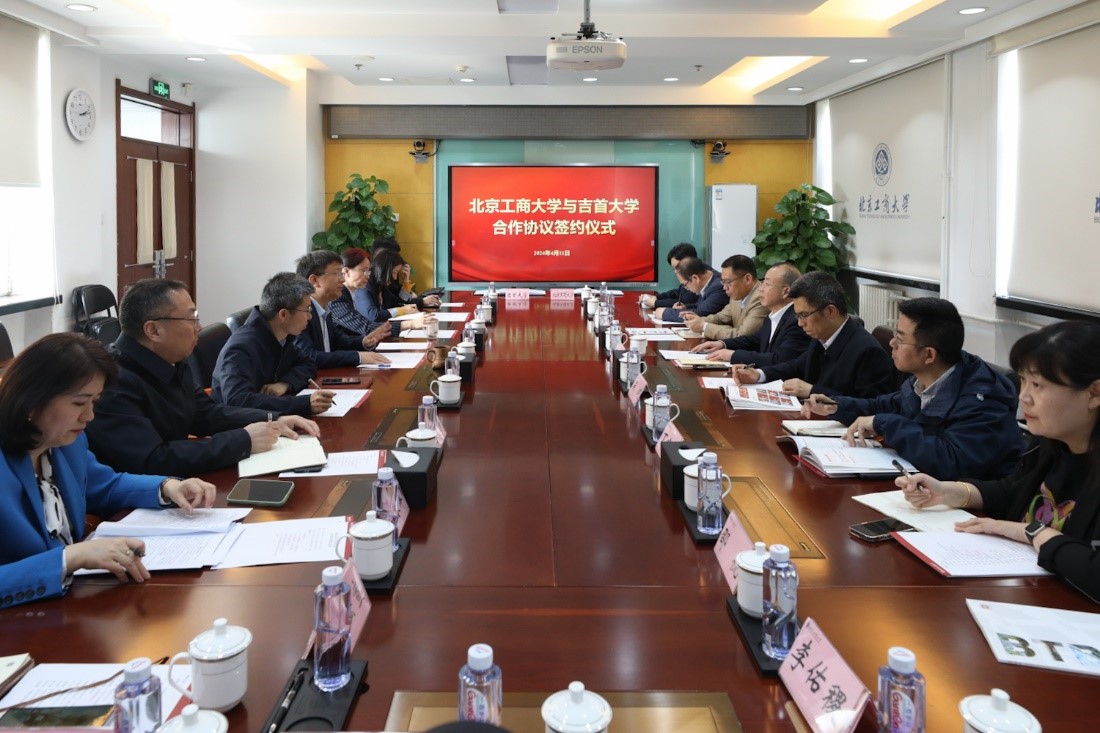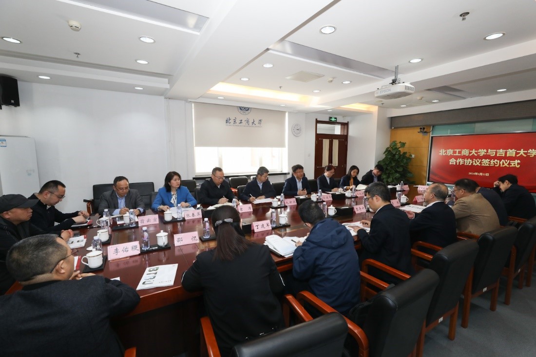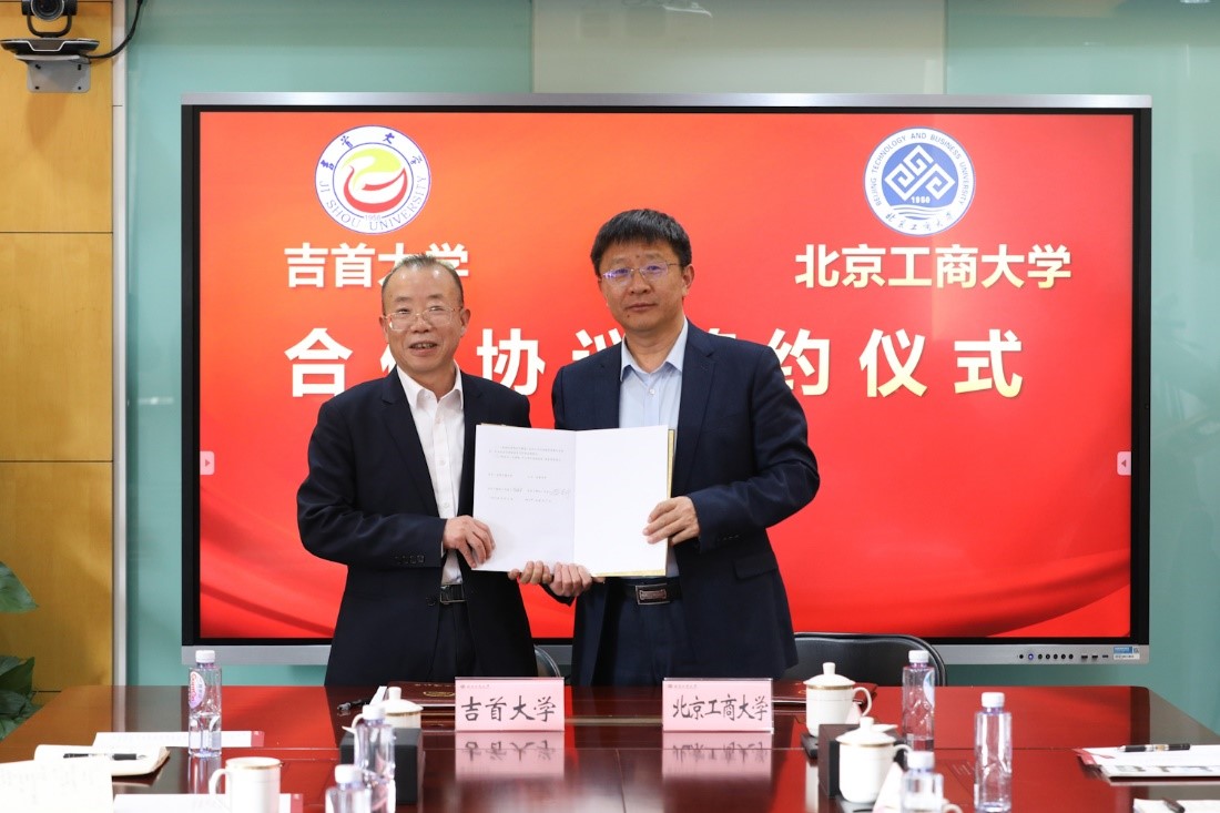 黎奇升对我校的热情接待表示感谢,并介绍了吉首大学的发展定位、特色优势及合作愿景。他指出,北京工商大学办学历史悠久,办学特色鲜明,地域优势突出,发展势头强劲。吉首大学是湖南省属综合性大学、国家民委与湖南省政府共建高校,也是武陵山片区范围内办学层次最高、综合实力最强、社会影响最大的教学研究型综合性大学,在音乐、舞蹈、冶金工程、植物资源开发利用、食品加工、湘西民族文化研究等方面具有突出优势。吉首大学与北京工商大学渊源深厚、交往密切,在新时代背景下具有良好的合作基础和广泛的合作前景。希望双方以此次签约为新的起点,充分发挥各自优势,深化学校间、学院间多层次交流对接,开展更务实、更广泛、更深入的合作,实现资源共享、优势互补、共建共赢。