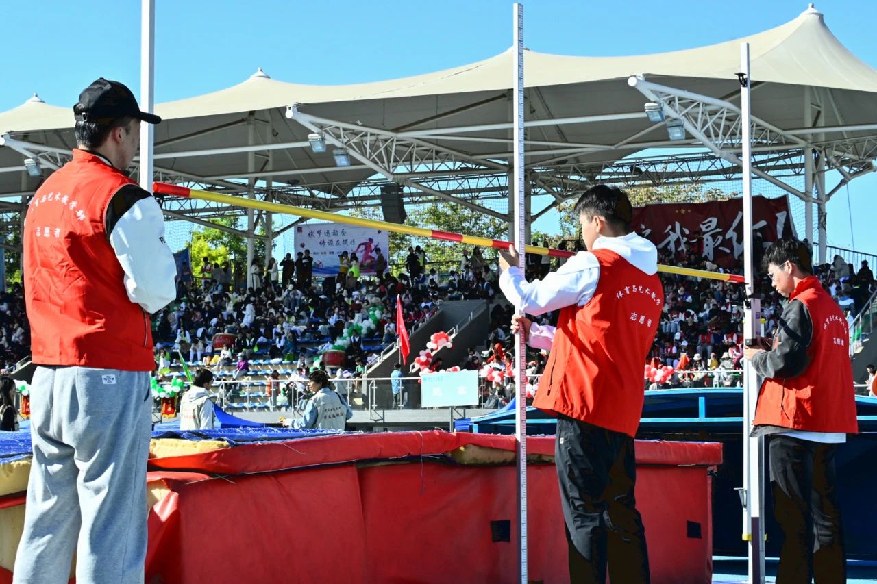 现场工作人员和学生志愿者们认真工作,为运动员们驰骋赛场提供良好的条件。