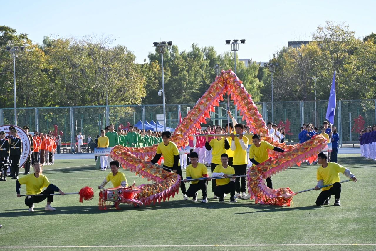 锣鼓喧天声声昂,双龙戏珠冲云霄。我校舞龙队带来精彩绝伦的表演。队员们手持游龙,振臂有力,步履协调。握、捻、转、摇一套动作干净有力、行云流水。两条游龙在霁蓝的赛道上腾空跃起,象征着北京工商大学将如巨龙般腾飞跃进。