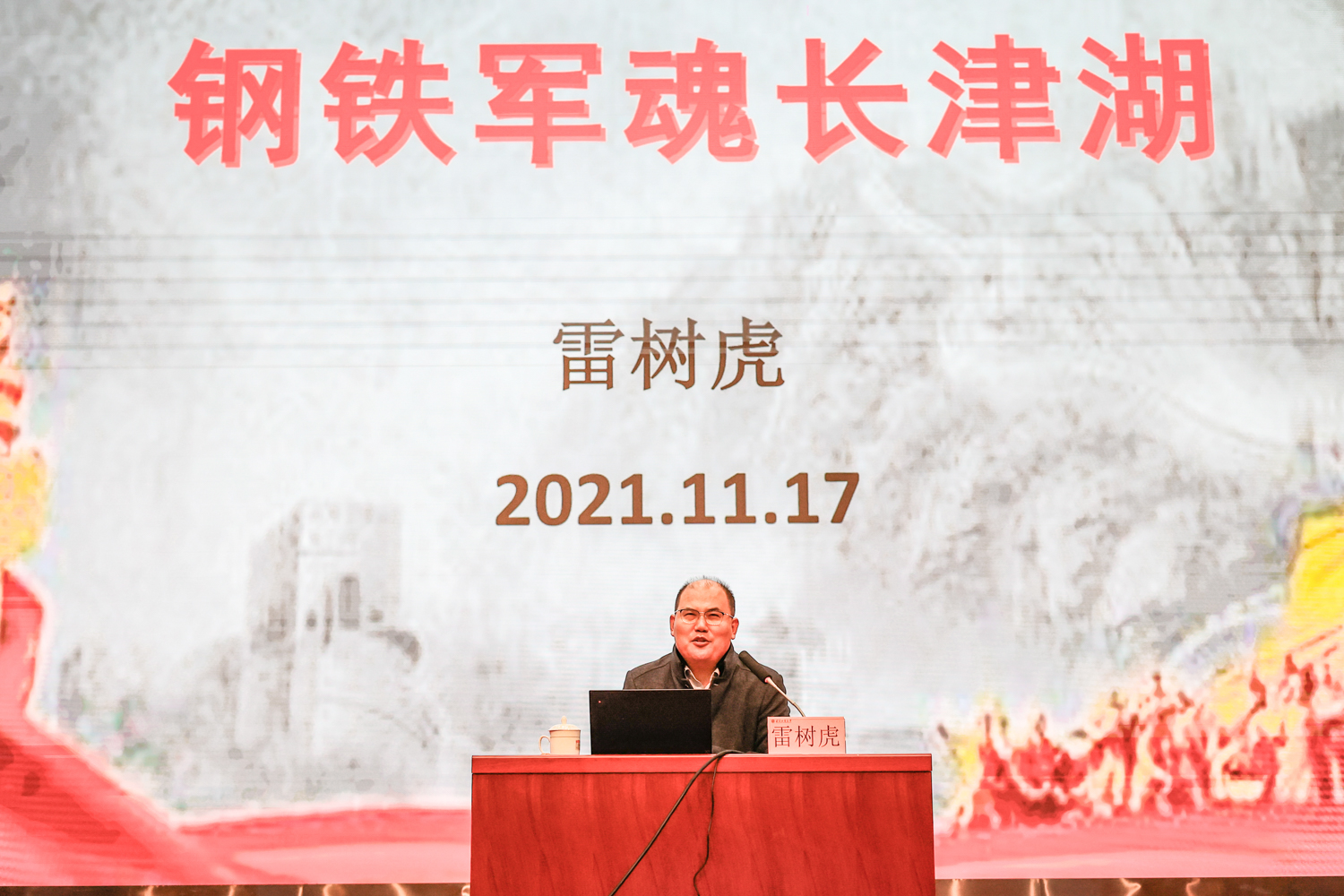 11月16日,北京新四军研究会副会长、北京铁军文化传播中心秘书长胡继军以“建党百年铸辉煌,共产党员是栋梁”为题,从共产党人的初心使命讲起,讲述了新四军军长叶挺将军以及胡继军的父亲、母亲、岳父三位新四军战士在战争年代坚定信念跟党走、英勇作战、不怕牺牲、无私奉献的故事,讴歌了中国共产党党员和人民军队坚定的理想信念、崇高的思想境界和优秀的道德品质。