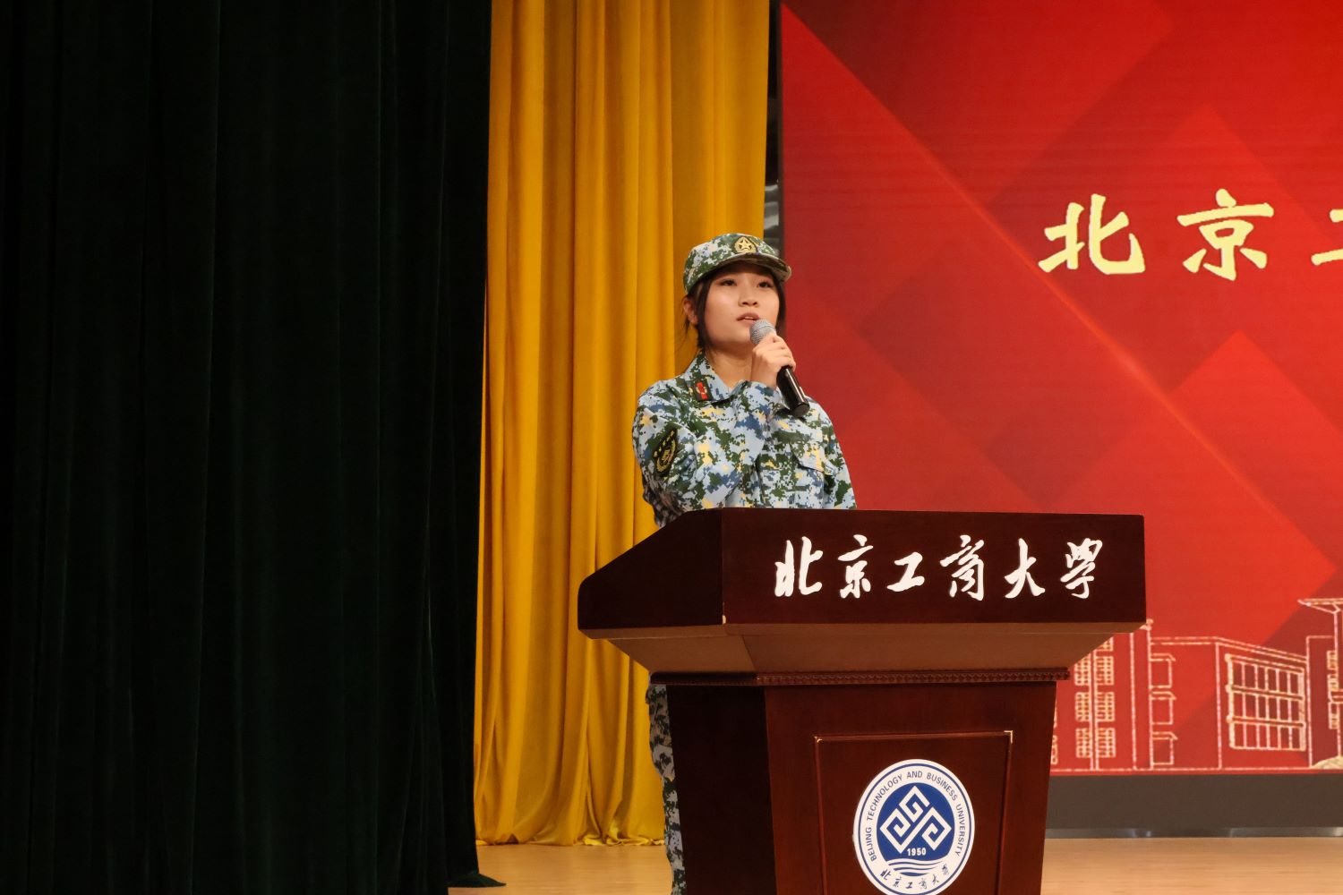 参训学员代表经济学院金融211班梁昕楠表达了由于疫情错过了往届精彩军训生活的遗憾,表示一定会珍惜学校专门组织的补训机会,在训练场上刻苦训练、不怕困难,亲身感受热血的“迷彩青春”,用汗水书写属于自己的军训篇章。