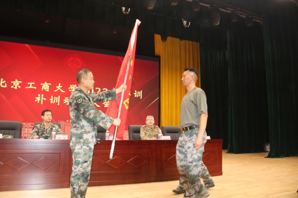 此次军训营营长、经济学院向小平和教导员学生处李昕霞共同为三个军训连授连旗。