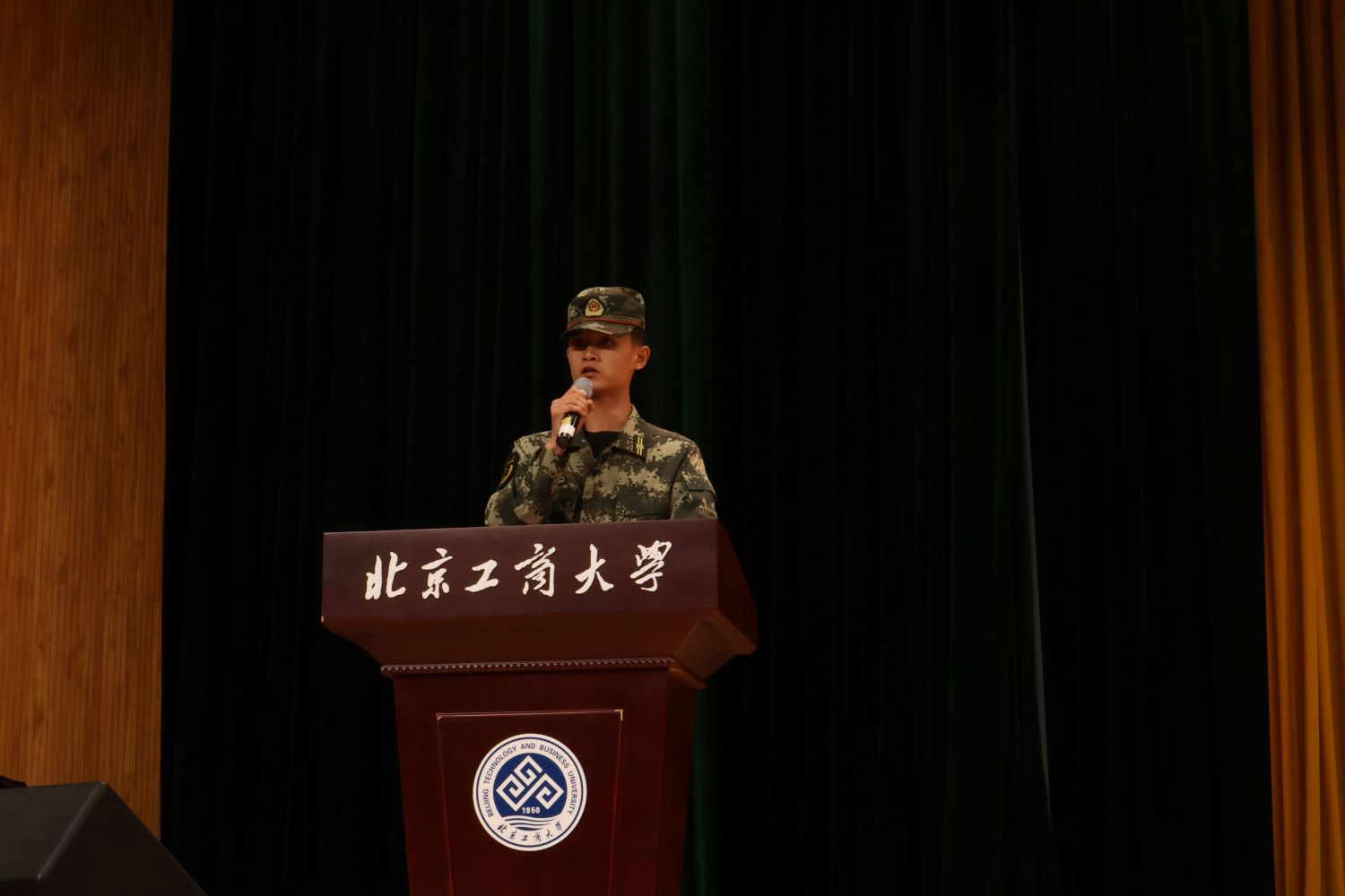 我校退伍大学生、此次军训营副营长、商学院注会204班孔维泽代表教官发言。他表示全体教官一定会竭尽所能,以身作则,以上帅下,把军事技能以及军队的光荣传统、优良作风传承给参训学生,力争最佳的训练效果,不辜负学校领导、老师、同学的信任和期待。
