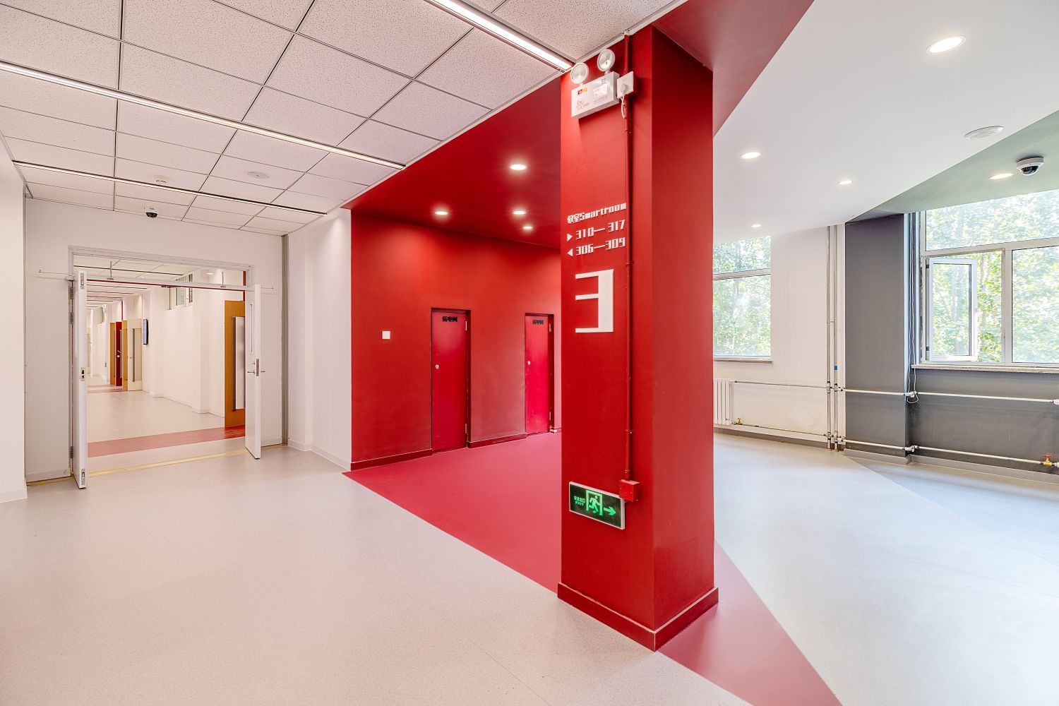 文二楼二、三层的精品教室以木色为主题色,并在家具上点缀楼层主题色,使教室内与公共空间呼应结合。四层的特色学科教室则按照各学科院色区分,使学生对所在的学习环境及学科专业产生归属感。四层新工科阶梯教室则采用食品与健康学院绿色;新商科阶梯教室的主题色采用商学院的红色;艺术类阶梯教室主题色采用传媒与设计学院的蓝色。