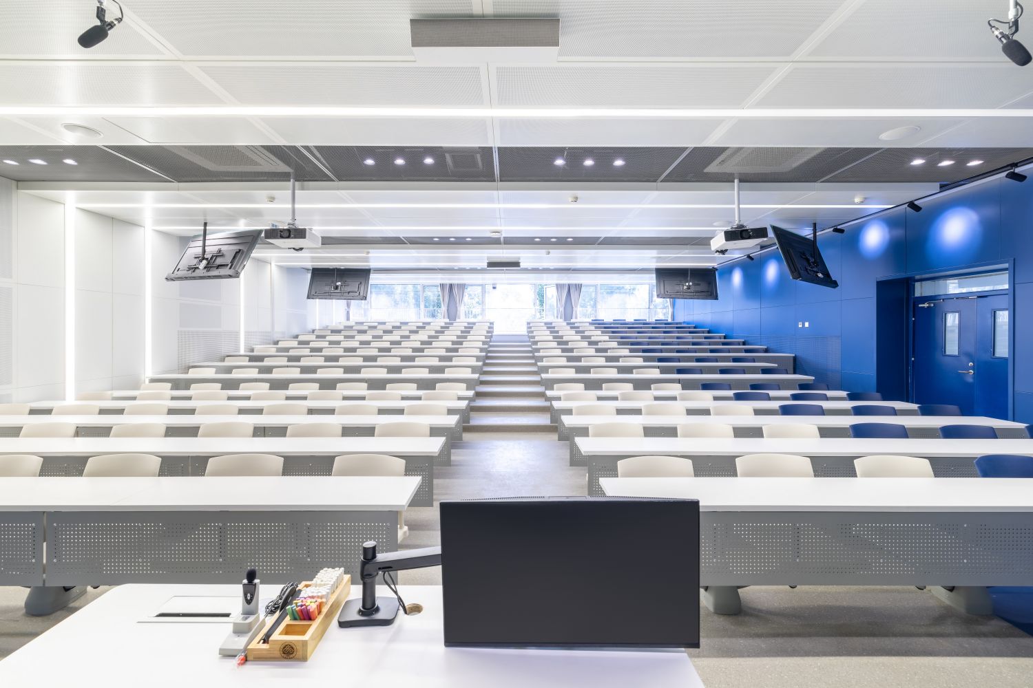新建智慧教室登录腾讯便可调用教室内摄像头,跟踪教师走动位置,便于线上学生观看教师授课、板书及互动,实现了线上线下混合式教学;提供了大屏、记忆黑板、电子白板、玻璃白板、实物展台等多种书写方式,每间教室黑板多层可推拉,大大增加了书写面积,实现了自由自主、随心便捷的书写模式;考虑到大教室幕布遮挡黑板的情形,中控面板首页设置了一键幕布升降功能,教师可随手调整幕布升降,免去了遮挡困扰;设置多种扩声模式,“一师一麦”、“一室一麦”,辅助吊麦,手持买和吊麦在不同区域讲话自动切换,教师即使未携带任何扩声设备,也不用担心授课扩声问题;电子时钟双面显示,无论教师还是学生微微抬头便可轻松观看时间;教室内教师机显示器采用大屏超薄配置,可触控、可书写,自带隐藏式摄像头,360度可旋转,便利教师教学;教室内使用U盘录制的课堂实录,下课拔走即带走,无需手动下载;教师讲台可升降,配有无尘膜衣粉笔、硬质粉笔、软质粉笔、喷水板擦、干湿两用板擦、电子教鞭、眼镜收纳,讲台边配有水杯托、衣帽钩,学生桌椅也配有桌斗,方便师生放置个人物品。类似的人性化设计细节还有很多,教务处始终秉持教学服务没有止境的理念,用心设计和处理每一处细节,也将在后续教学过程中不断听取师生的使用意见反馈,积累完善,精益求精。