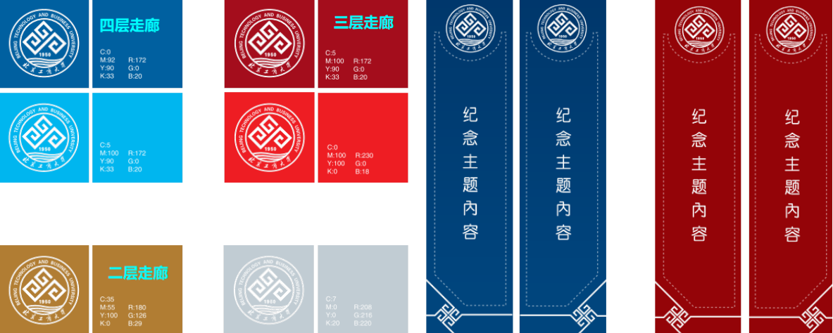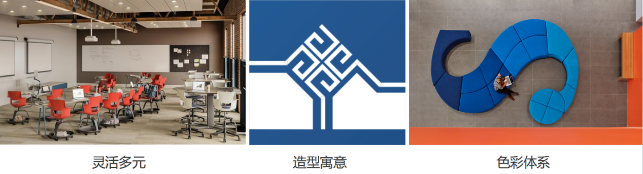 挖掘文化内涵,突出“工商融合”的设计思路。本次设计学习空间类型因更加丰富、灵活、多元,空间界面、灵活家具、设备设施的紧密结合设计,将发挥传统教学所无法替代的功能与体验。设计语言汲取学校校徽中的折线设计理念,结合工商首字母“G”与“S”的形式,在室内设计界面进行细化与升华,营造具有北工商校园特色文化的空间环境。空间色彩体系上呼应本校作为高水平研究型大学的发展目标,以学校标准色为基础,结合各学科标志色融合设计,突出鲜明的校园文化特征及多元化的学科特色。