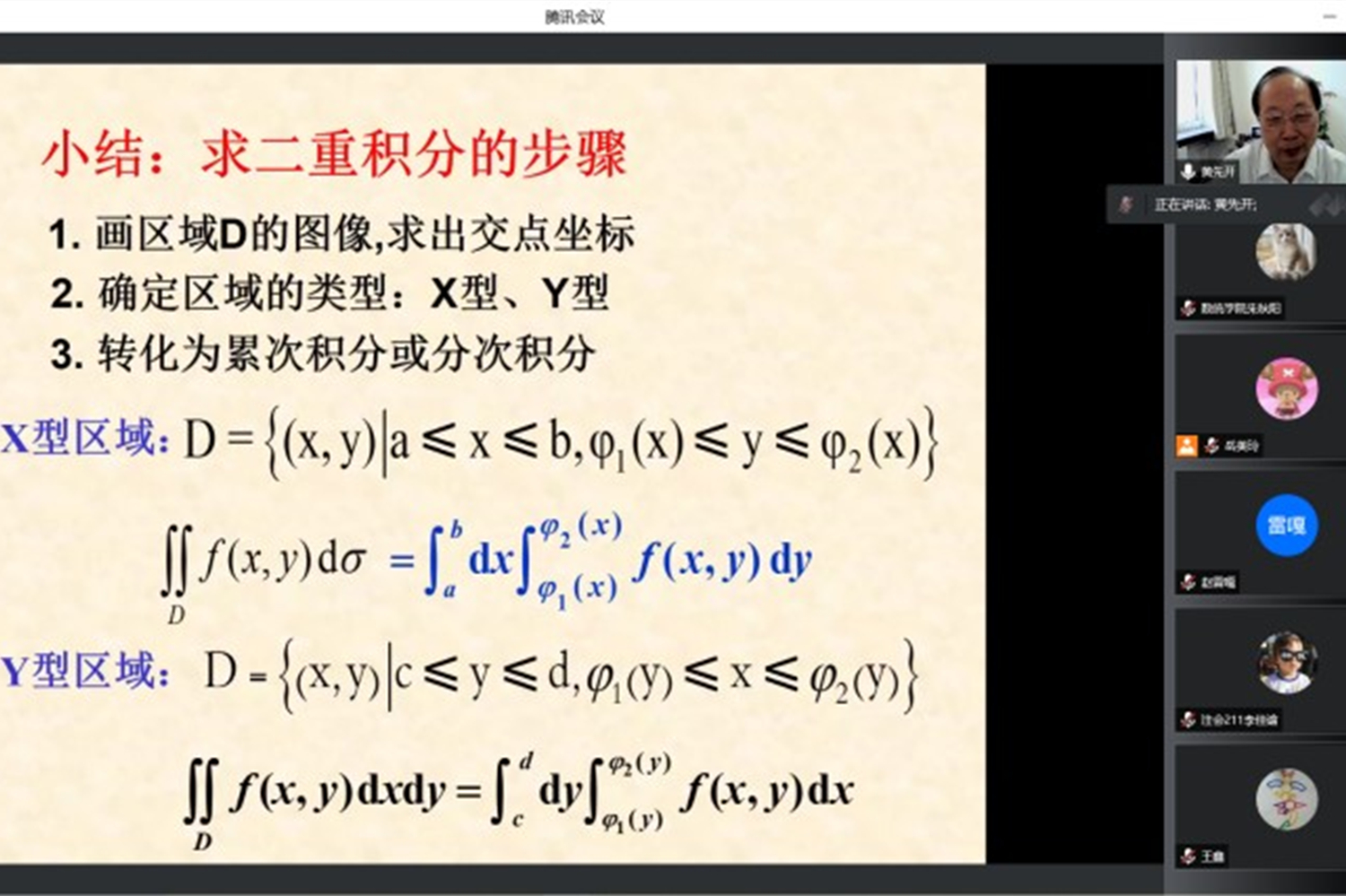 本次课程的主题是二重积分的计算。黄先开教授首先带领同学们复习了二重积分的概念即分割、近似求和、取极限,并用例题讲解二重积分的计算。对于复杂积分区域和无法求出原函数的情况,黄先开教授演示了分解被积区域和变换积分顺序两种方法处理问题,加深了同学们对知识的理解,体现了知识之间的衔接性。黄先开教授强调,直角坐标系下计算二重积分的关键是对积分区域的处理和找到最优解决顺序,并向同学们总结了解题的一般步骤:先观察边界曲线,再寻找函数特征,分析出最优积分顺序。