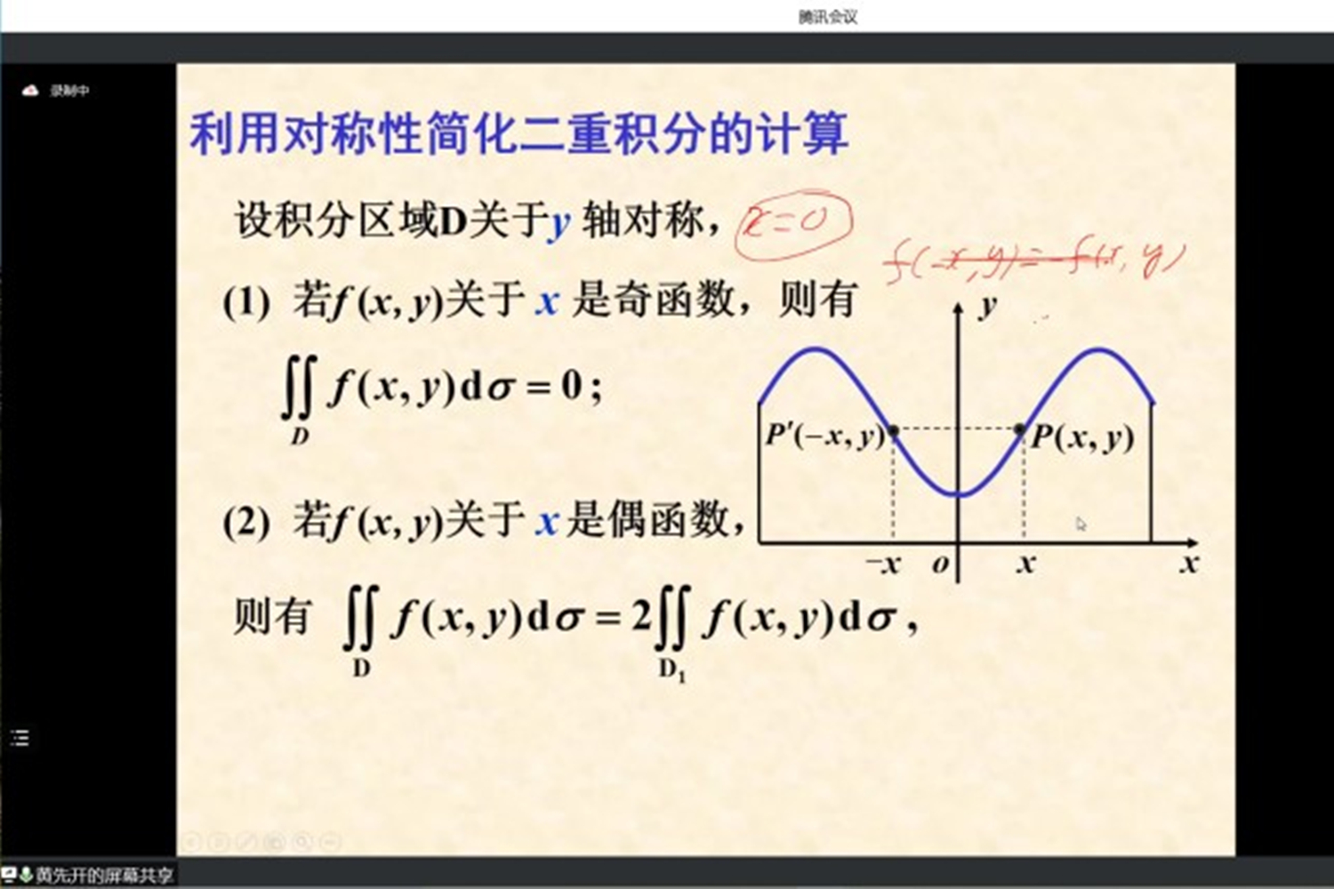 黄先开教授向同学们演示如何利用二重积分的对称性解决复杂问题,总结出存在奇偶性的被积函数和积分区间,通常可以利用积分的对称性化简计算过程。他利用轮换对称性巧妙地解决了当被积函数是抽象函数的情况,避免了复杂的数学公式推导,引导同学们利用技巧获得更快速、简洁的解题过程。当被积区域是圆或圆的一部分或被积函数包含圆的表达式时,黄先开教授向同学们演示了使用极坐标系处理问题,相对于直角坐标系更直观、简洁,计算上也将更方便、高效。