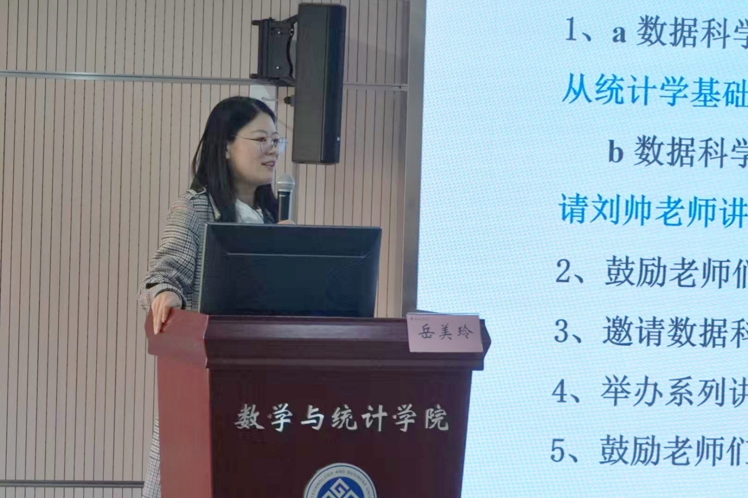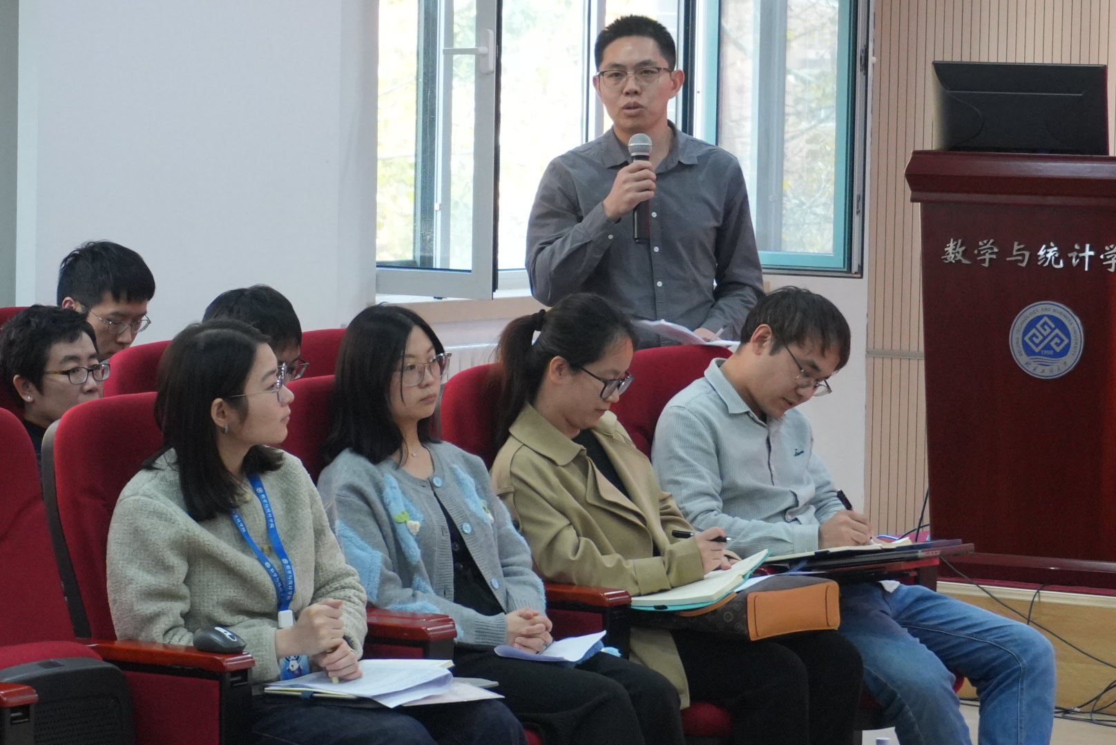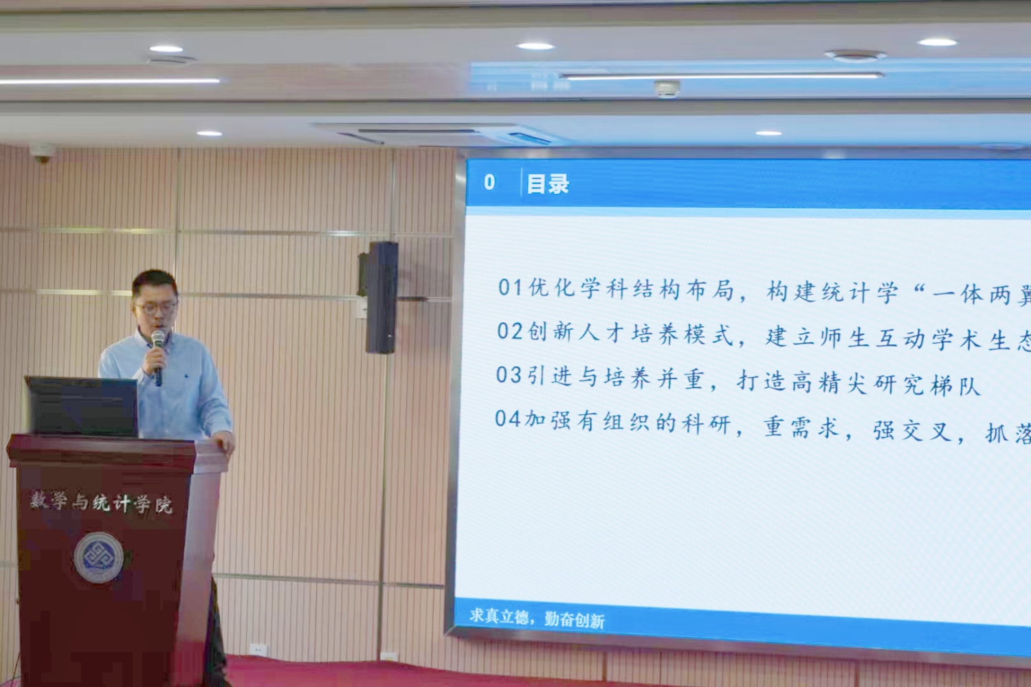 数学与统计学院副院长王康以“锚定一流学科,突出交叉特色,明晰战略定位”为主题,围绕学科布局、人才培养、研究梯队和科研发展四个方面进行专题汇报。应用统计系主任谢峰、数据科学系主任岳美玲、经济统计系主任赵江分别就各系的基本情况、研究方向和未来规划进行了汇报交流。