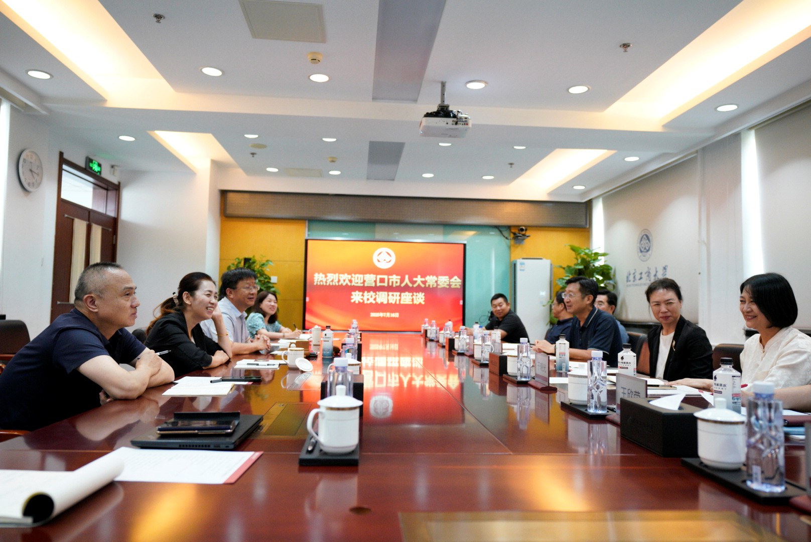 郭建华对营口市人大常委会一行表示热烈欢迎。他简要介绍了学校办学定位、办学理念和发展现状等情况。他指出,作为北京市高水平研究型大学,北京工商大学具有“工+商”的天然优势,近年来,学校立足自身特色,把握发展机遇,回应时代需求,坚持以“工商一体化”为引领,努力以学校所能,服务首都所需,各项事业取得高质量发展。他表示,希望以此调研座谈为契机,全面加强沟通协作,深化产学研用合作,推动营口市与北京工商大学在更多领域实现互利共赢。