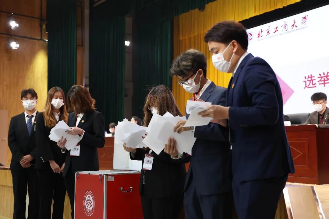 在工作人员带领下,大会宣读了《北京工商大学第十一次学生代表大会选举办法》,选举产生了4名第十一届学生会主席团成员。