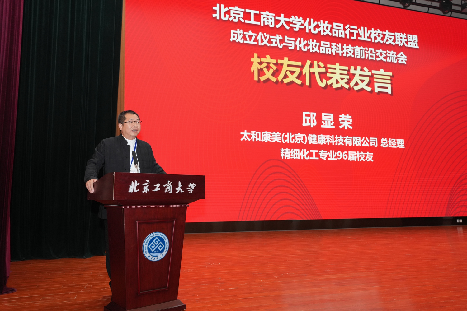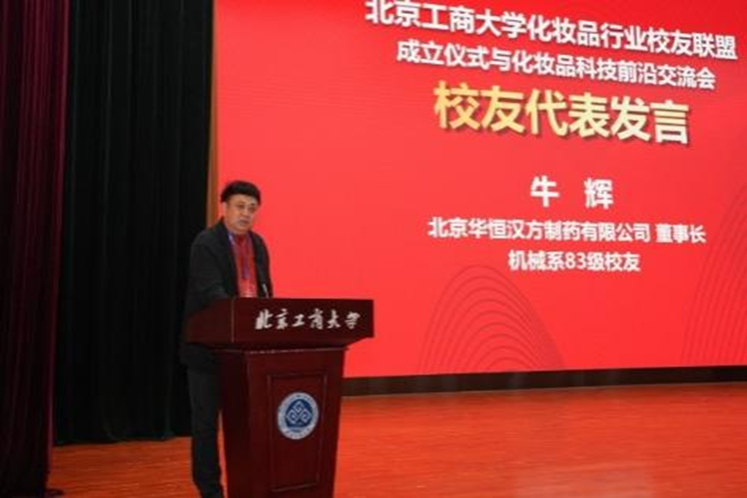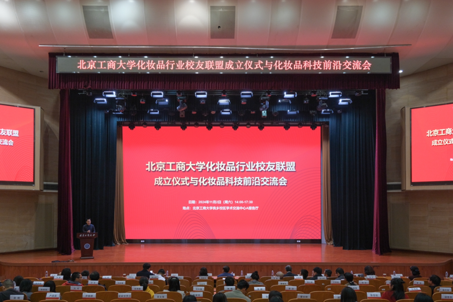 11月2日下午,北京工商大学化妆品行业校友联盟成立仪式与化妆品前沿科技交流会在良乡主校区举行。教育部高等学校轻工类专业教学指导委员会秘书长、四川大学轻工科学与工程学院原院长何有节,中国日化协会理事长王万绪,学校党委常委、副校长、校友会会长毛新述出席活动。校友会秘书长张春萍,轻工科学与工程学院党委书记姚志良、数学与统计学院执行院长曹显兵,化妆品专业资深专家闫世翔教授,轻工科学与工程学院党委副书记王嘉彦,副院长徐伟钦、易帆,化妆品研究院院长董银卯,执行院长贾焱,国际化妆品学院副院长、化妆品监管科学研究基地执行院长孟宏与化妆品行业校友代表等200余人出席大会,共同见证这一凝聚校友力量、推动行业发展的重要时刻。
