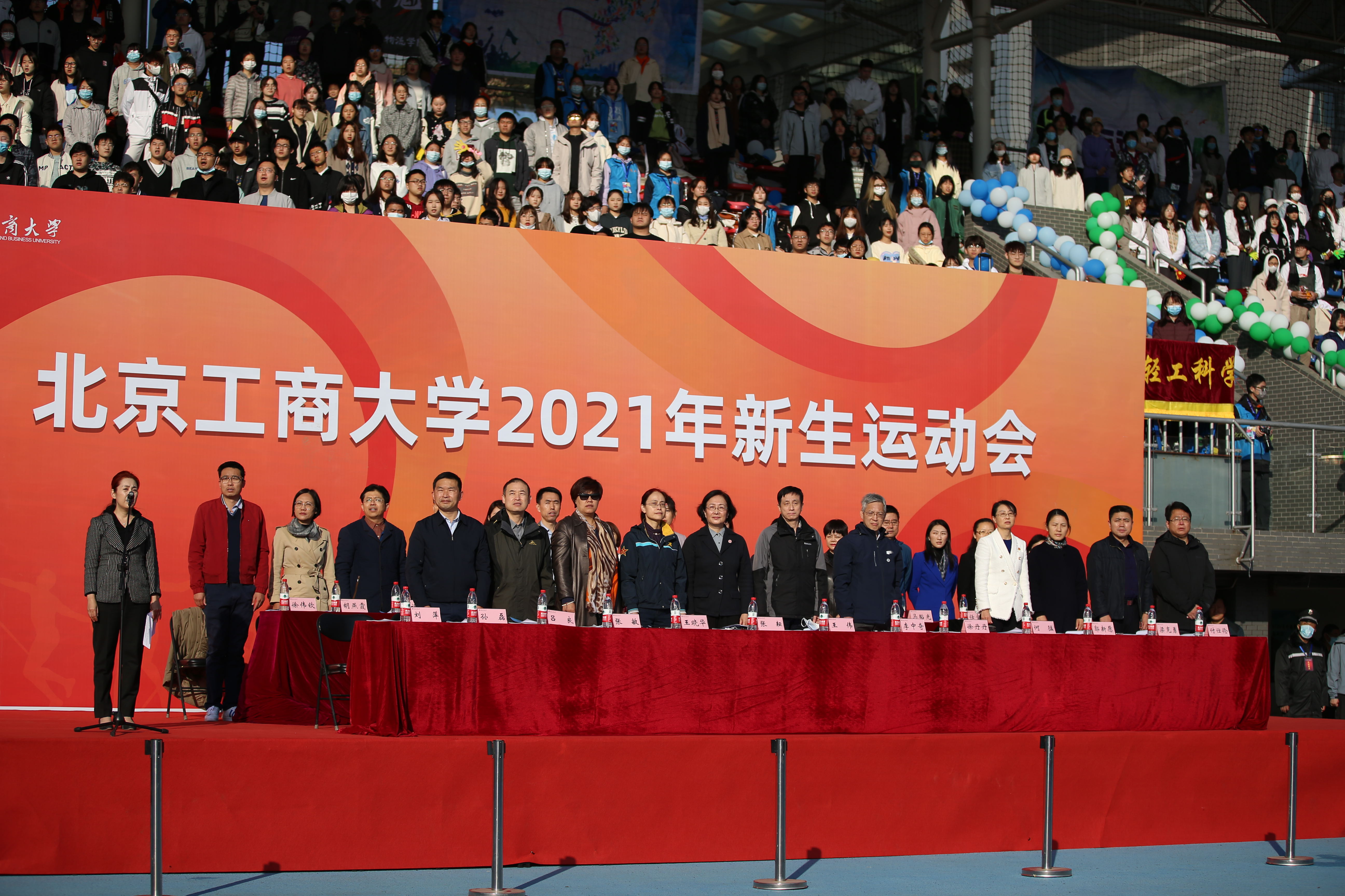 张耘副校长宣布“北京工商大学2021年新生运动会开幕”,王伟副书记为首场比赛鸣响发令枪。