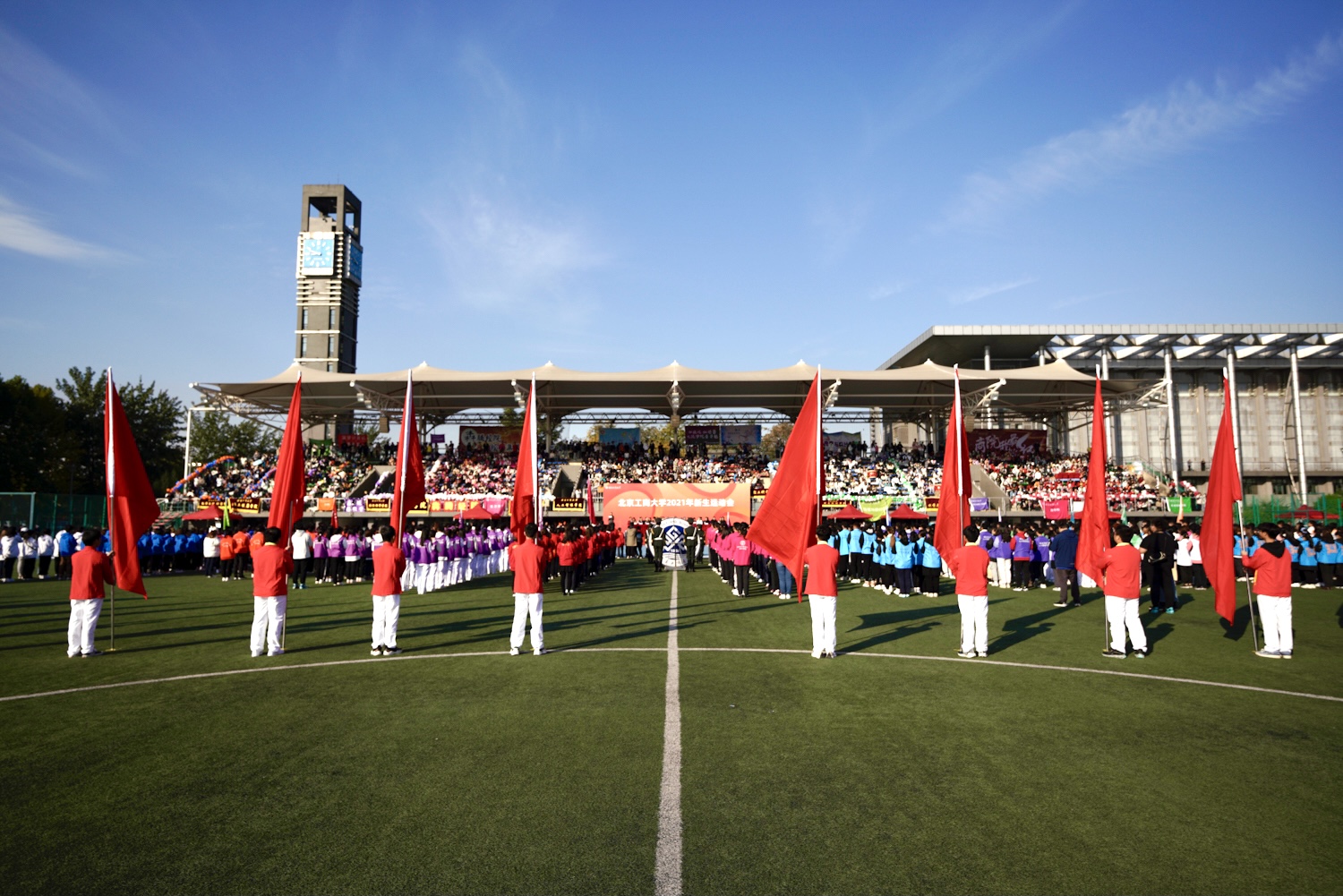 各学院各色旗帜和精心准备的横幅将柏林蓝操场装扮一新。伴随着运动员进行曲,学院方阵、国旗护卫队以饱满的热情步入运动场。整齐的方阵彰显着青春朝气;国旗护卫队步伐铿锵、英姿飒爽;运动员们热情洋溢,自信昂扬;看台上,观众井然有序,欢呼声响彻会场。体育与艺术教学部、学生处、公共事务处、保卫处、校团委、党委宣传部等相关部门工作人员也已就位,为比赛的顺利进行保驾护航。