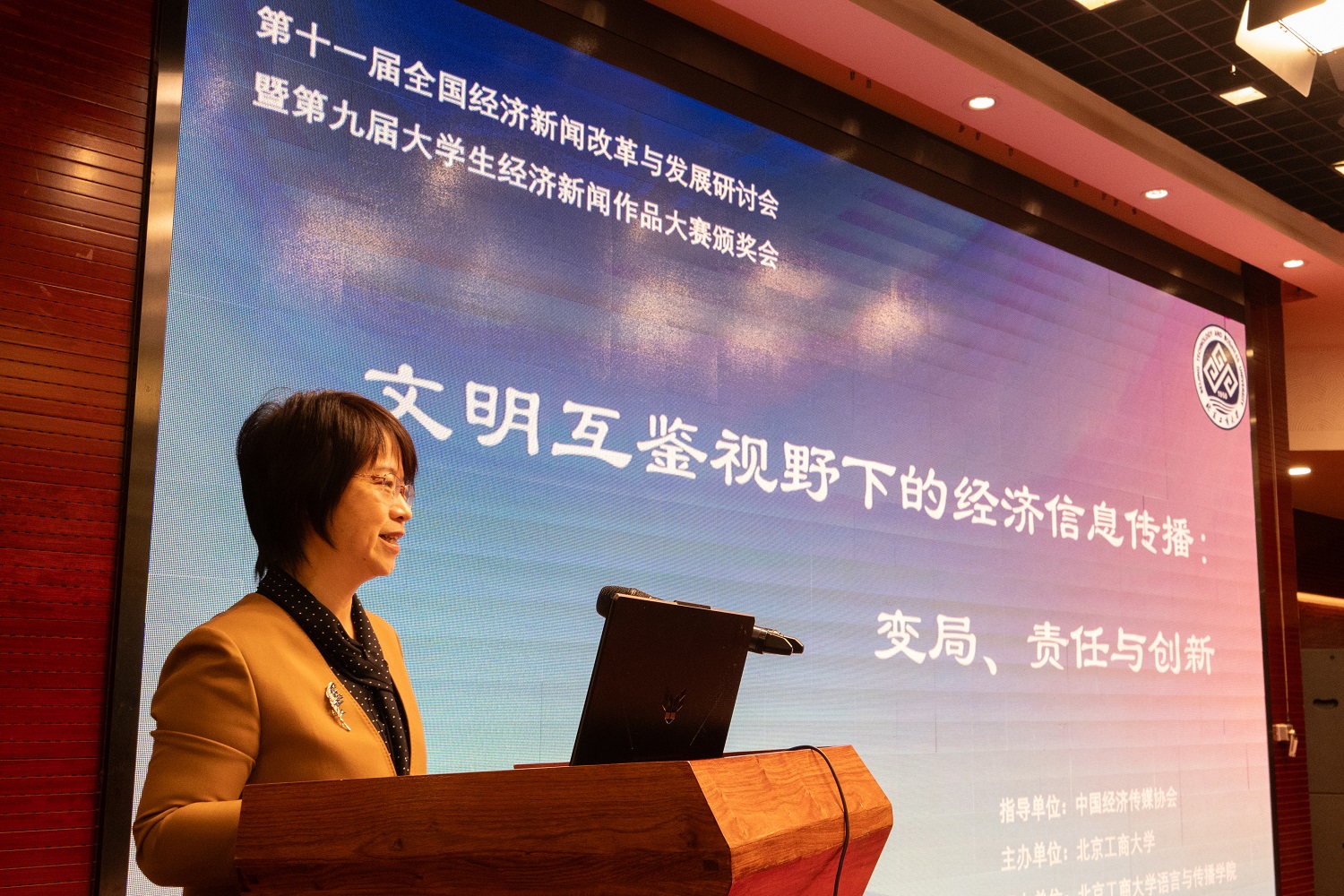 11月29日,由中国经济传媒协会指导、北京工商大学主办、我校语言与传播学院承办的第十一届全国经济新闻改革与发展研讨会在京召开。我校党委书记沈千帆出席会议并致辞。教务处处长王鲁娜,语言与传播学院党委书记刘影、院长王擎、副书记徐鑫、副院长张慧子出席会议。来自北京大学、中国人民大学、中国传媒大学、中央民族大学、上海财经大学、宁夏大学、浙江工商大学、安徽财经大学等高校的学者,与中国社会科学院、中国外文局、中央广播电视总台、北京商报、每日经济新闻、中国证券报等单位和媒体的专家共聚一堂,围绕“文明互鉴视野下的经济信息传播:变局、责任与创新”这一主题展开思想碰撞与深度交流,共话经济新闻改革与发展大计。