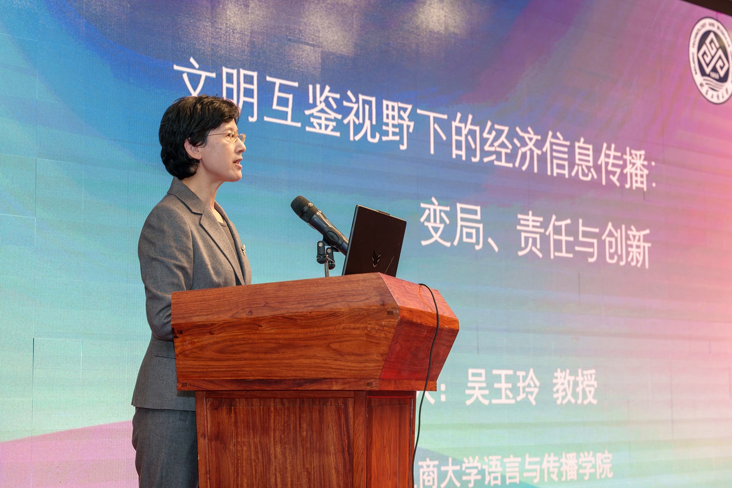 上午的主题演讲由我校语言与传播学院吴玉玲教授主持。中国社科院新闻与传播研究所所长胡正荣教授、中国外文局当代中国与世界研究院副院长孙敬鑫、北京大学新媒体研究院院长谢新洲教授、《每日经济新闻》副总编辑丛刚、北京商报社社长兼总编辑李波涛等专家,围绕“国际传播中的中国经济话语与叙事”、“学习四中全会精神,做好经济报道的时度效”“生成式Ai使用的全国性调查——从‘用户之变’看经济信息传播新趋势”、“AI引领——每经的探索与实践”、“消费创新背景下的媒体环境变化及应对”等议题分享了最新的研究成果和思考,内容兼具学术深度、实践价值与指导意义。