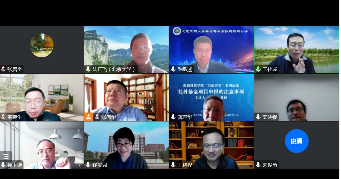 为进一步推动会计学科建设发展,提升会计专业学位人才培养质量,商学院于12月15日在线组织召开会计专业学位建设研讨会,会议邀请了中国人民大学王化成教授、北京大学陆正飞教授、北京国家会计学院秦荣生教授、清华大学肖星教授、中国人民大学支晓强教授、中国财政科学研究院徐玉德研究员、中央财经大学刘俊勇教授、对外经济贸易大学钱爱民教授,我校谢志华教授、王鹏程教授对会计专业学位建设工作进行全方位指导。我校副校长龚六堂教授出席会议并致辞。会议由研究生院院长兼商学院院长毛新述教授主持,商学院副院长张伟华教授、会计系主任张晨宇参会。