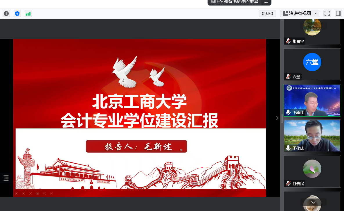 毛新述从学位点基本情况、师资团队、招生与就业、培养方案设置、实践基地、社会服务特色与优势等方面对会计专业学位建设情况进行汇报,并详细介绍了会计专业博士学位建设规划。