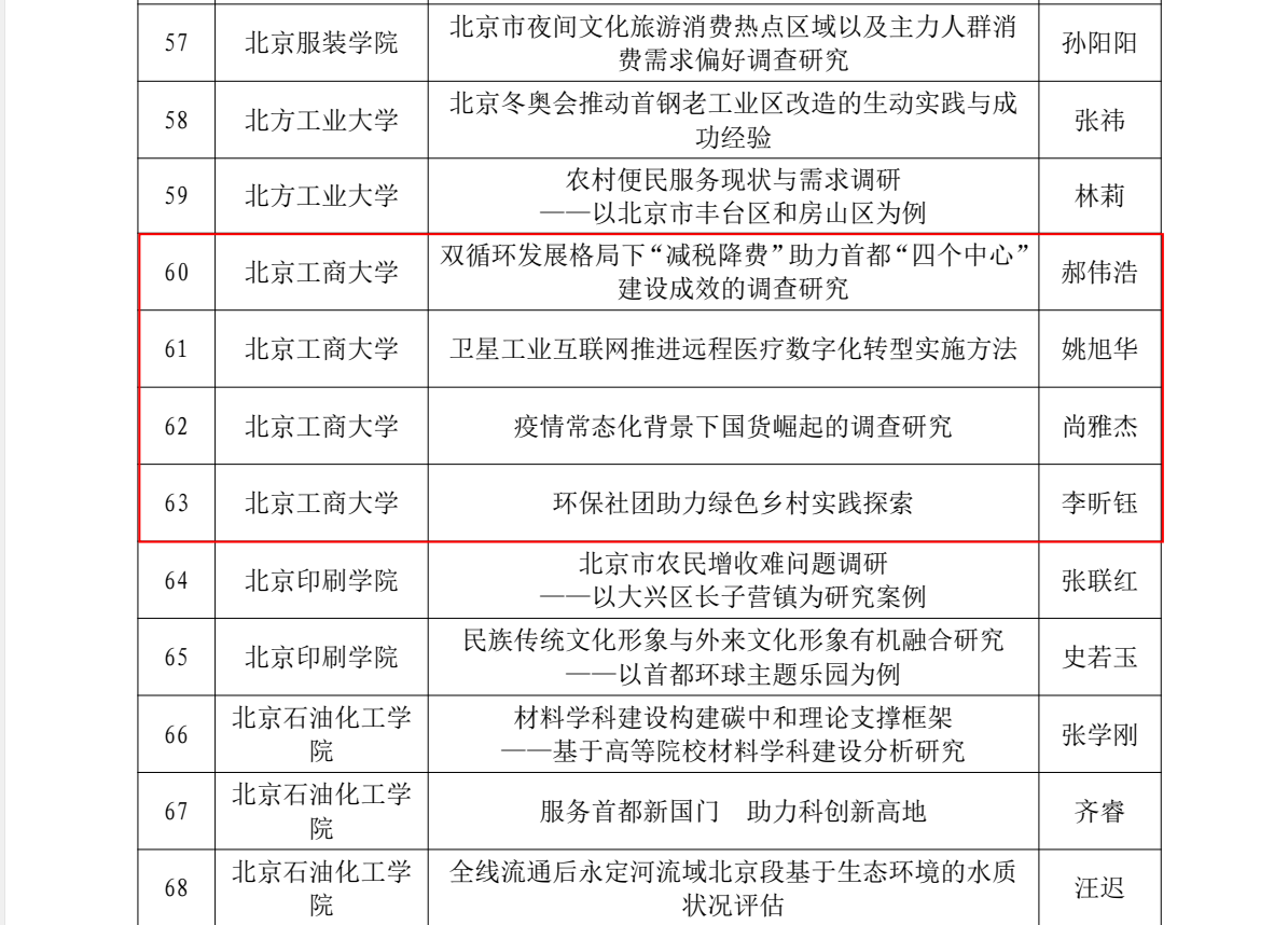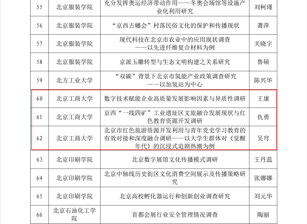 我校入选师生各项目团队自立项起,认真按照项目计划执行,克服疫情影响等困难,围绕“数字技术赋能企业高质量发展研究”、“京西‘一线四矿’工业遗址区文旅融合发展现状与红色教育资源开发”、“北京市红色旅游资源开发利用与青年党史学习教育的有效对接和深度融合调研”,以及“双循环发展格局下‘减税降费’助力首都‘四个中心’建设成效”和环保助力绿色乡村建设等主题,线上线下相结合广泛开展社会调研和实践,积极参加项目主题理论研讨会并发表相关成果,取得了良好成果和显著成效,展现出我校师生心系家国服务首都、立足实践贡献才智的良好风貌。