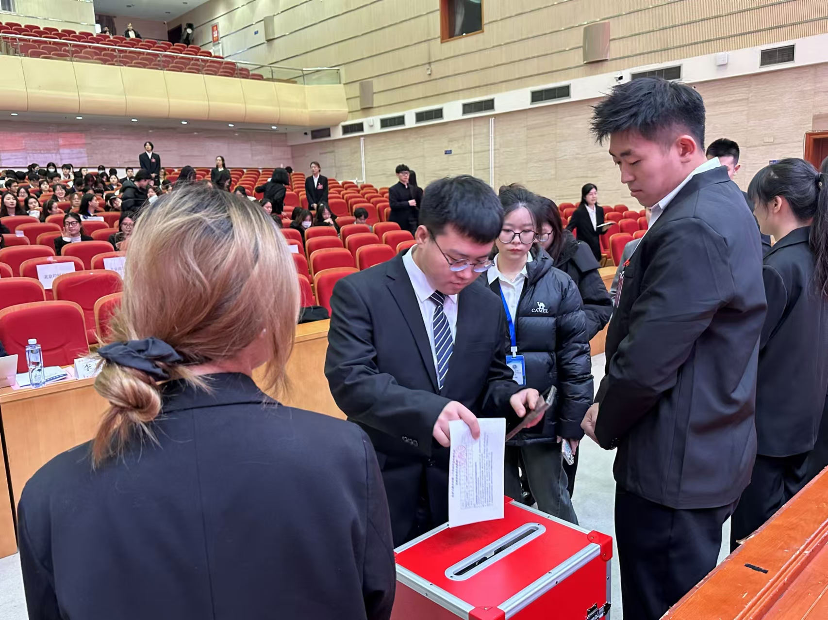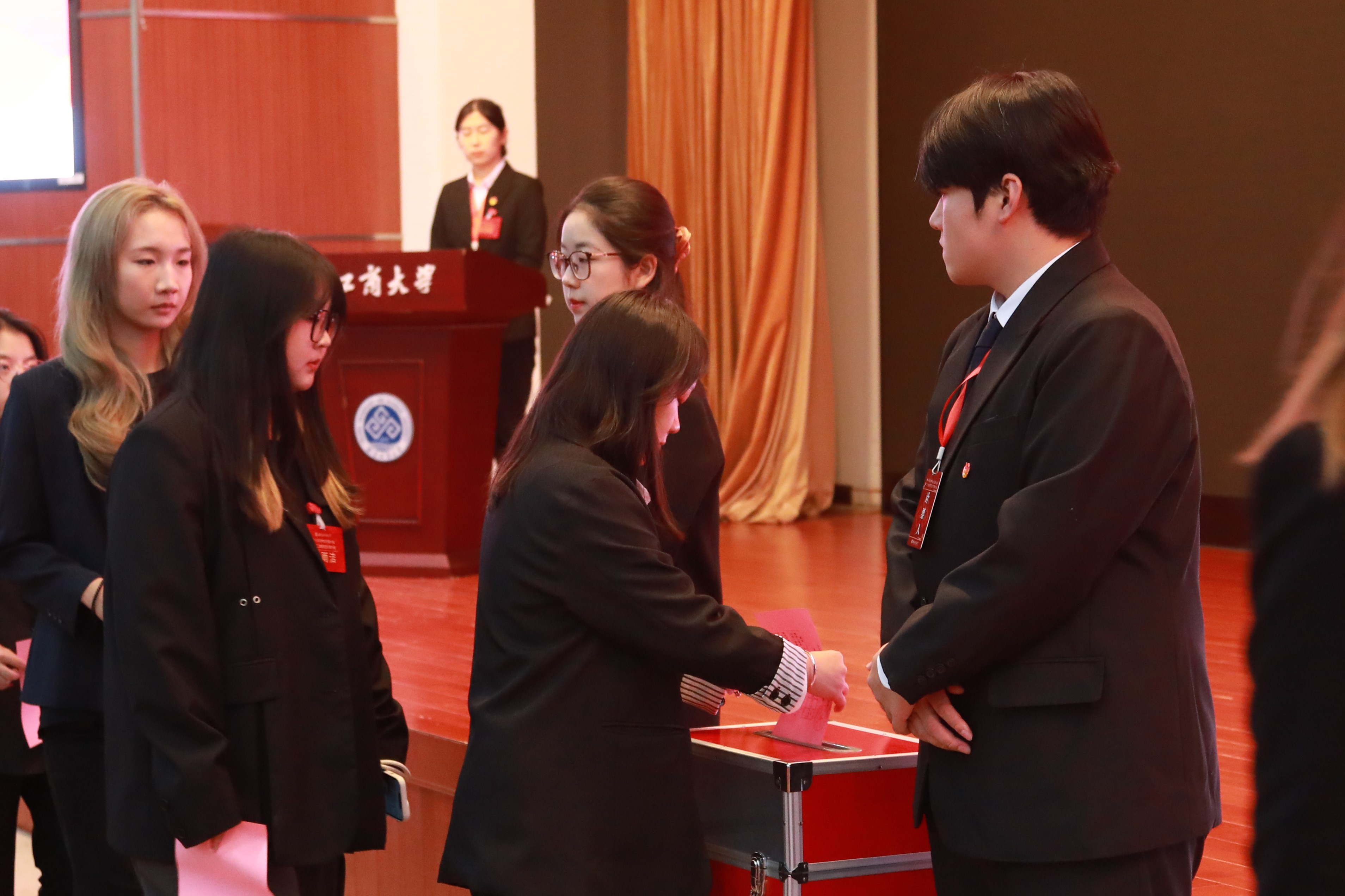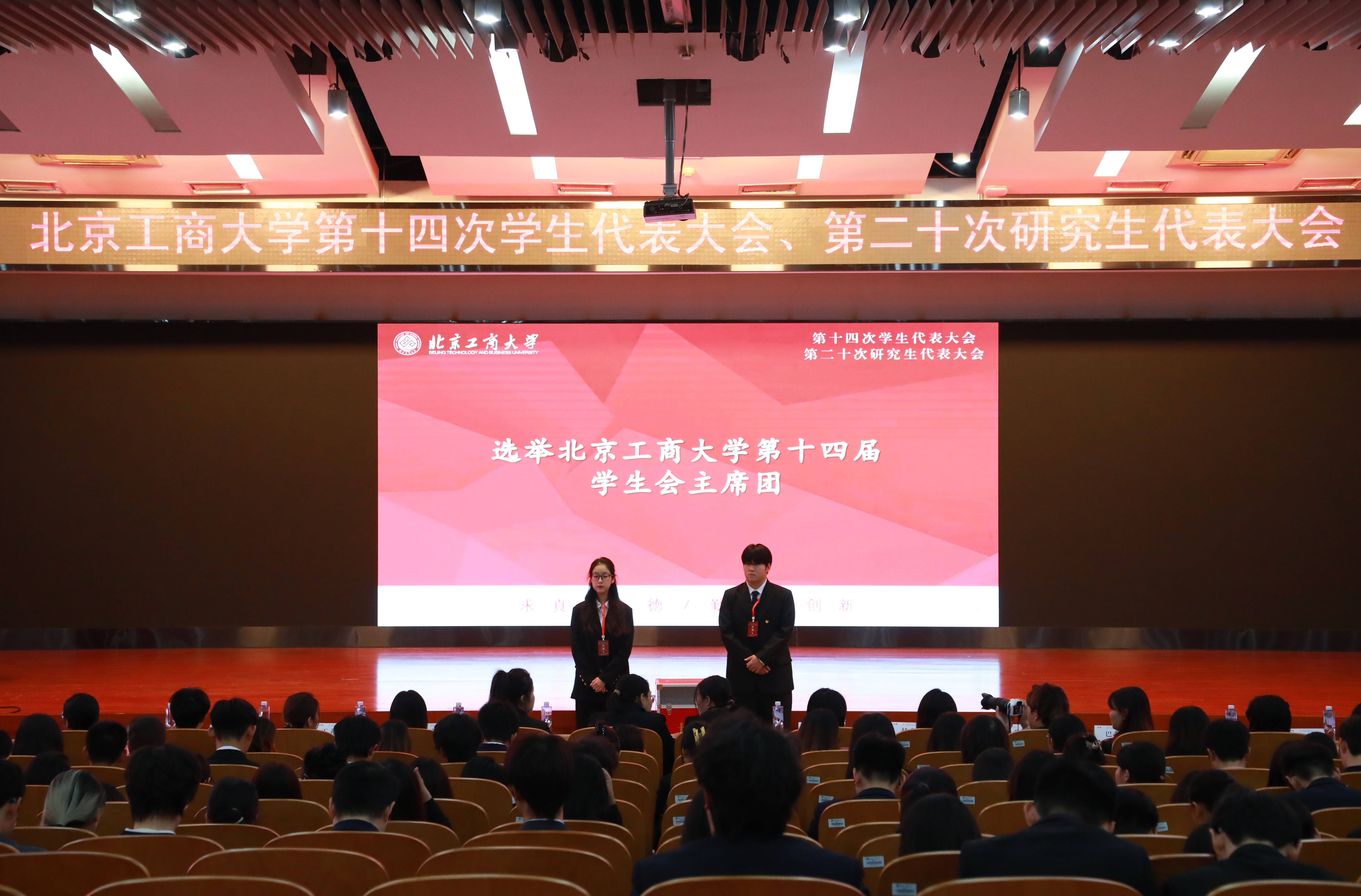 在工作人员带领下,大会宣读了《北京工商大学第十四次学生代表大会选举办法》和《第二十次研究生代表大会选举办法》,分别选举产生了5名第十四届学生会主席团成员和5名第二十届研究生会主席团成员。