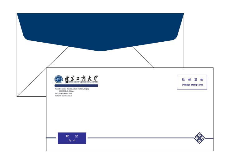 信封是传达北京工商大学大学形象的媒介之一,本页列举DL号信封的使用规范,在实际应用中严禁对标识与名称的组合方式、标准色以及设计版式做任何改动。