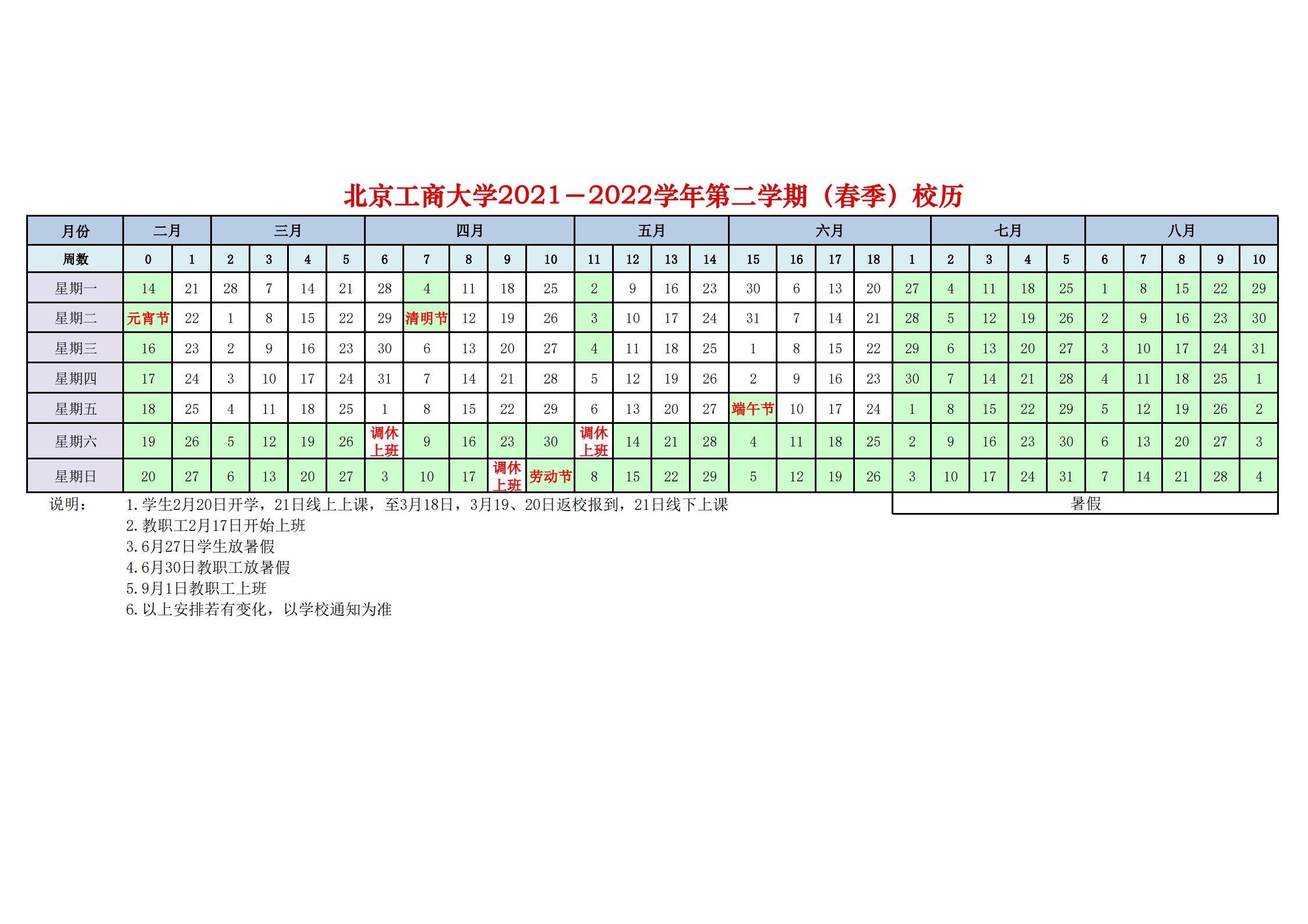 2021-2022学年第二学期(春季)校历