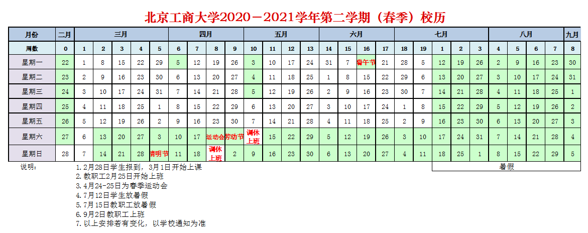 2020-2021学年第二学期(春季)校历