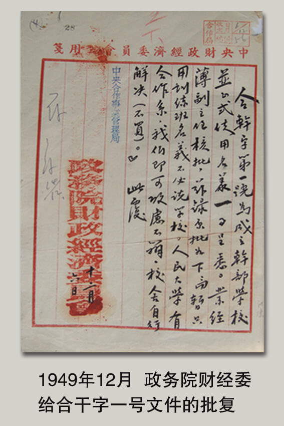 1950年2月,经政务院财经委员会批准,1949年12月获批成立的中央合作事业管理局干部学校开始招生,校址在北京西四北大街红罗厂12号。7月,中央合作事业管理局干部学校改名为中华全国合作社联合总社干部学校,无产阶级革命家、我国经济战线杰出领导者程子华任校长。
